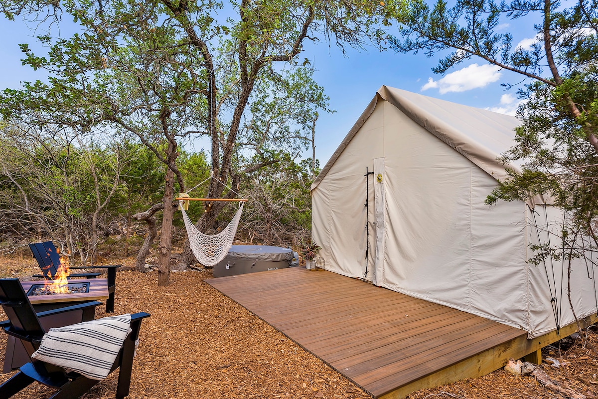 Reconnect with nature at these unforgettable glamping escapes. 3 tents available (Estrella1UnderStars, Estrella3UnderStars). Our hill country property is set on 11 acres of private secluded land. Only miles from dining shopping & Fiesta Texas, but far enough to feel like an outdoor paradise. Low light restrictions promote an elite stargazing experience. Amazing views, bird watching, surrounded by trees & nestled in the valley of Cross Mountain Ranch. Private gated entry. Glamorous Camping...OMG!