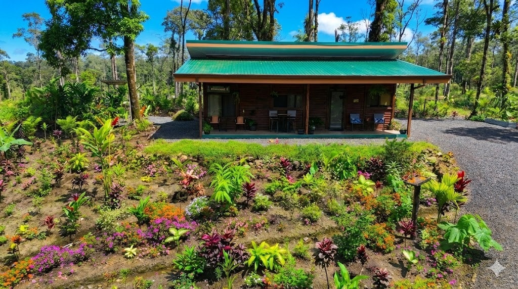 🏡Ta čudovita betonska koča v slogu hlodovine je košček miru! 🥘🍳🔥Popolna kuhinjska klimatska naprava, zaščitena okna in zapečatena vrata 🛏️🚽2 BR (1 ensuite) 2 BA + futon. 🫧👕Pralnica 📶5 GFiber Optic Wi-Fi 🍍Vključuje zajtrk, sadje, prigrizke, osvežilne pijače in higienske izdelke. Nahaja se le nekaj korakov stran od Rio Celeste. Opazovanje ptic na kraju samem! Pohodništvo, slap, jahanje, kmetije s čokolado in kavo, labirint, tubing, narodni park Volcan Tenorio, lenivci in nočni ogledi s prostoživečimi živalmi - VSE v nekaj minutah!