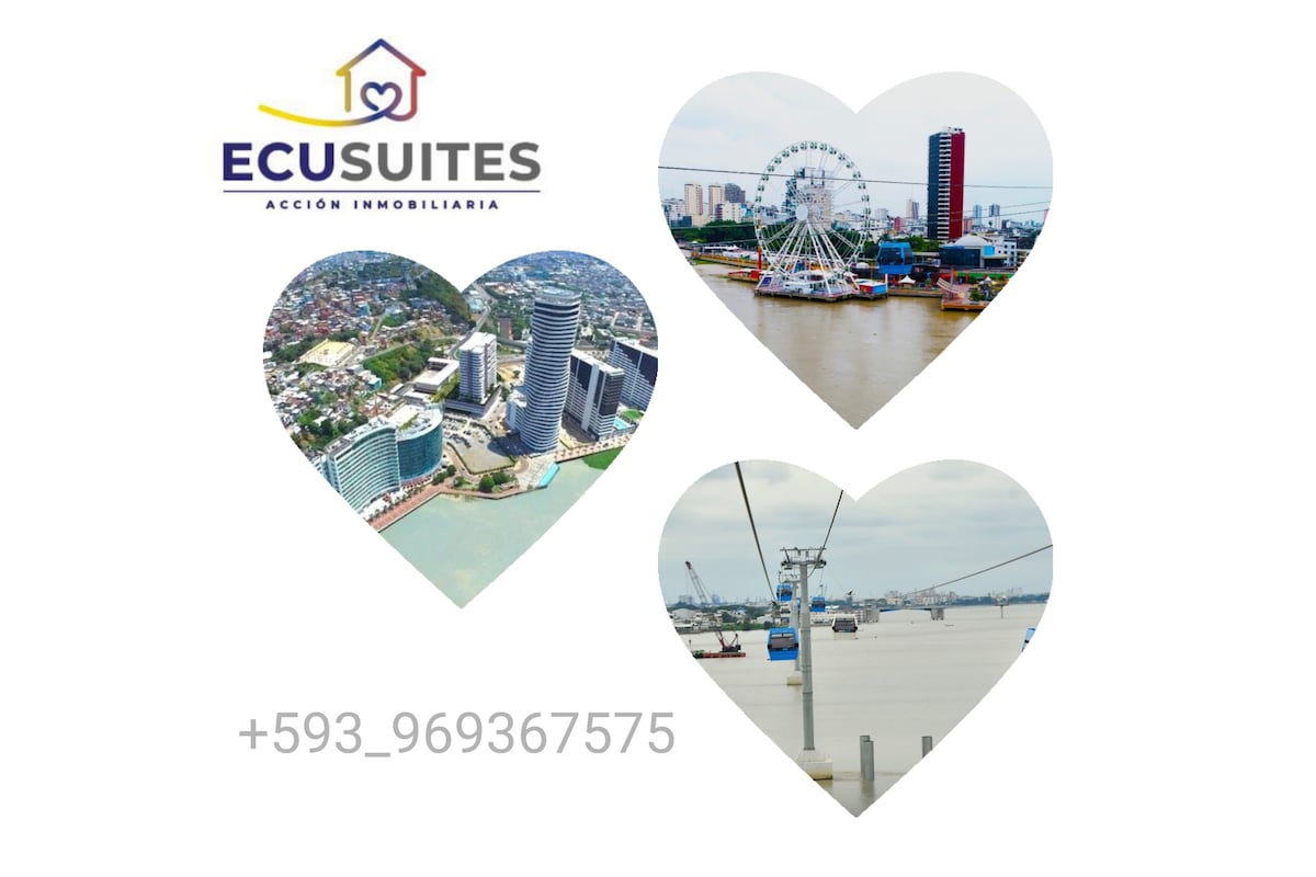 Ecusuites +593_93 917 6452 Exclusivo y Elegante Departamento Full amoblado, Edificio Torres Bellini IV, Puerto Santa Ana a lado del Hotel Wyndham, a 3 minutos Aeropuerto. Ubicacion en el mejor sector Turístico cerca Malecón 2000 y Las Peñas.