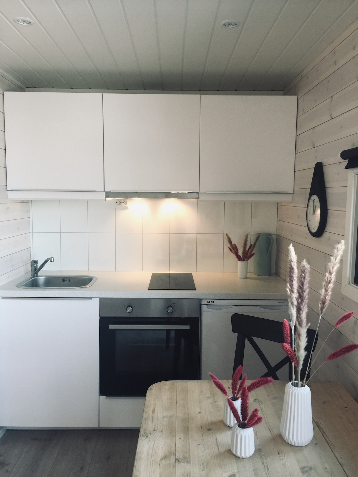 Naša vrtna hiša ima navaden norveški standard za kabine z vsem, kar potrebujete za enostavne obroke. Na voljo bodo nekatere osnovne zaloge hrane. Ker v vrtni hiši nimamo tekoče vode, smo v kuhinjo postavili avtomat za vodo. Vaša kopalnica, s talnim ogrevanjem in tušem, se nahaja tik ob vratih, v glavni hiši. Vrtna hiša ima lastno teraso, z dostopom do vrta.