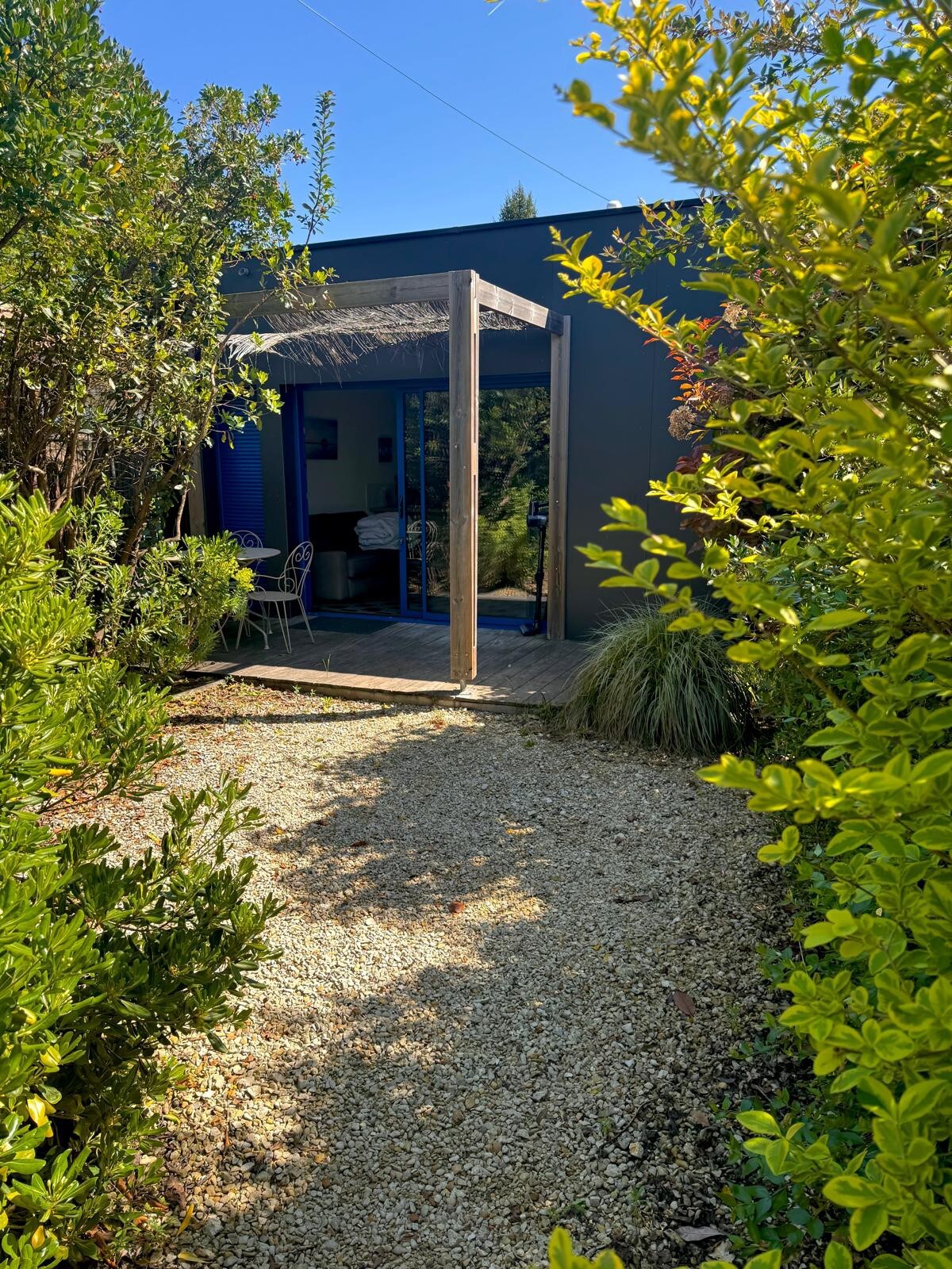 Situation idéale entre Arcachon et Cap-Ferret. Andernos Betey : à 100m du port et plages du bassin, 8 min à pied du centre ville... Accès direct piste cyclable, Biocoop et boulangerie à 200m Plages océanes 15km T2 situé dans la dépendance de notre propriété entourée de végétation. 21m2 + chambre en mezzanine : Petite cuisine équipée, coin repas, canapé, TV & barre son, s.d'eau avec wc fermé + douche extérieure chaude ! Terrasse couverte 30m2 côté sud, table et repos au milieu des bambous !!