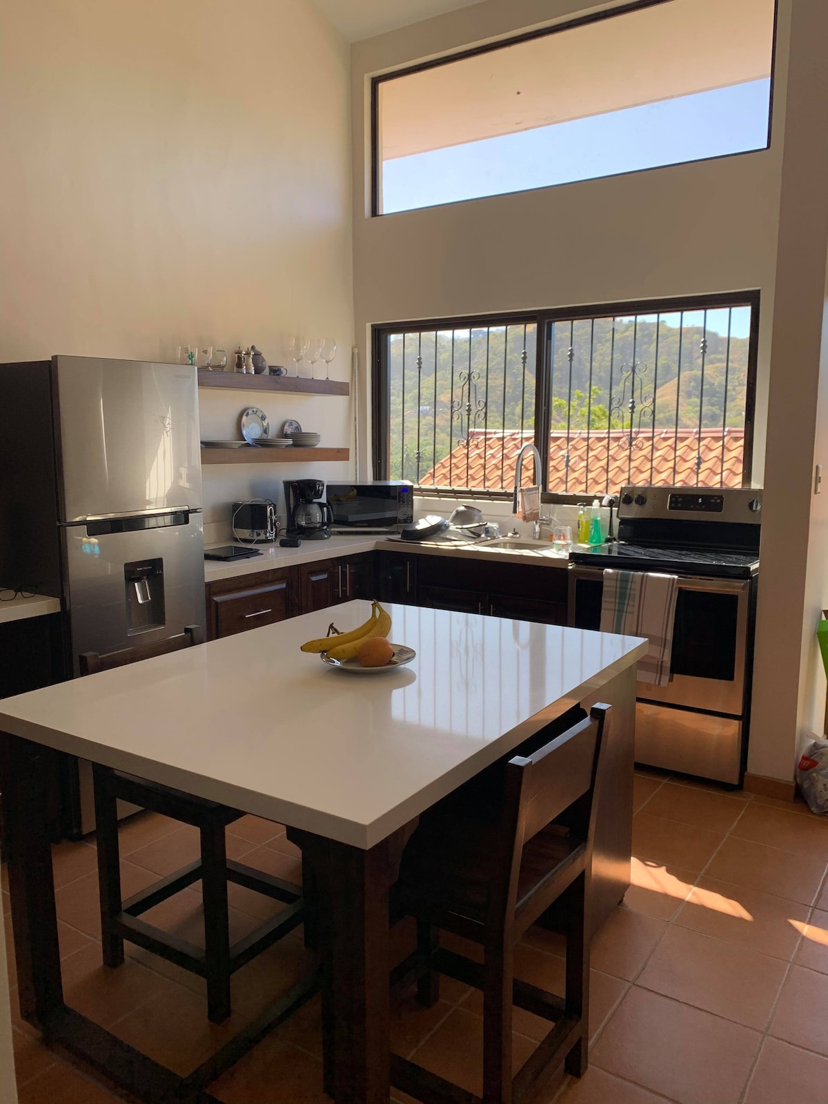 Uživajte in se sprostite v tem svetlem in prostornem, elegantnem predelanem stanovanju s čudovitim razgledom na gore in skoraj zasebnim bazenom. 800 m do plaže Ocotal in slavnega prenočišča Farther Rooster. Stropi katedrale, odprta obokana zasnova. Klimatska naprava, ventilator, poln WR v vsakem nadstropju. Rezervoar za toplo vodo, pralni stroj, popolnoma opremljena kuhinja z granitnim pultom. Odlično za romantičen oddih ali delo na daljavo. Zakonska postelja v 2. nadstropju, raztegljiv kavč na 1. nadstropju. Zadnja terasa, balkon, ranč ob bazenu. Komarniki, varnostni bari, brezplačno parkiranje.