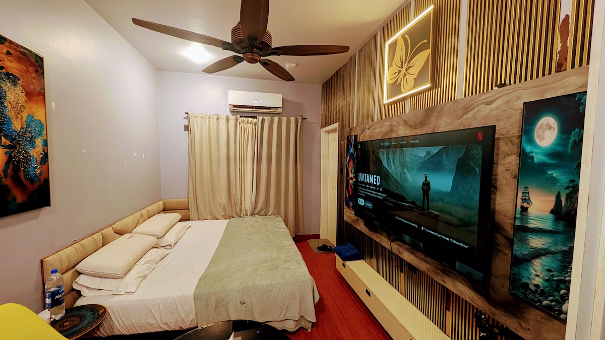 Odkrijte eleganten, minimalistični studio v 6. fazi DHA, ki je zasnovan za udobje in priročnost. V klimatizirani spalnici je zakonska postelja za miren spanec, v dnevnem prostoru pa so na voljo raztegljiv kavč, stoječa svetilka in ogledalo v polni dolžini. Ostanite povezani z visokohitrostnim Wi-Fi-jem, uživajte v zabavi na televizorju visoke ločljivosti in izkoristite kompaktno kuhinjsko nišo z osnovnimi napravami. Studio se nahaja v bližini najboljših restavracij, kavarn in nakupovalnega središča ter je odlično izhodišče za vaš obisk Karačija.
