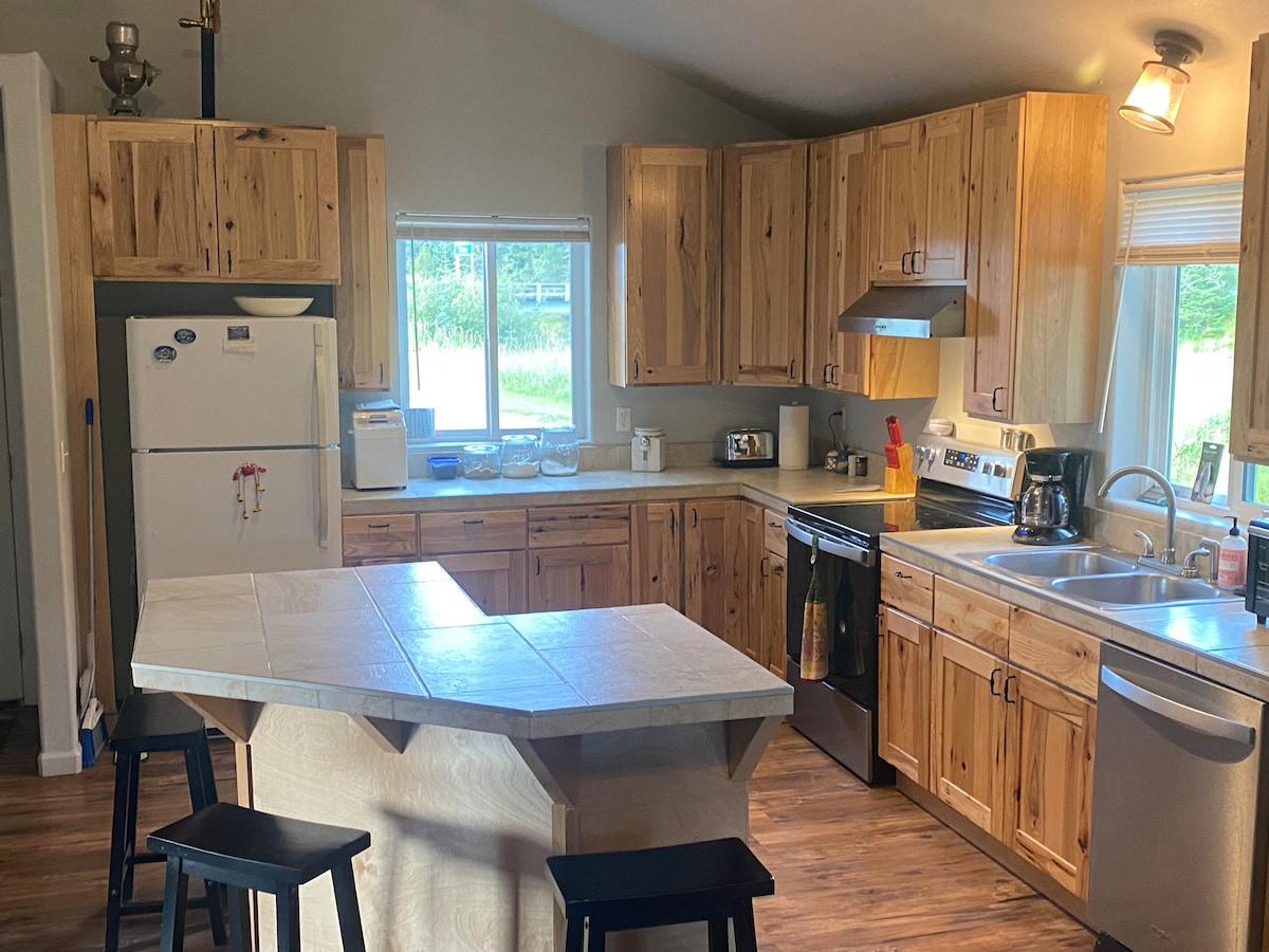 Welcome to the cabin in the woods in gorgeous Gustavus, AK! Our recently renovated home is loaded with everything you need for a comfortable, cozy stay. Starlink internet, brand new appliances, well stocked kitchen, smart TV, everything you could hope for! Centrally located off of Wilson Rd, we are a short drive to "Four Corners", the center of town. Lovely views of the Salmon River from the second floor. There is a full size bed as well as a full air mattress.