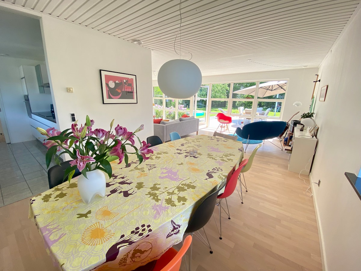 Nyt luksus sommerhus på 115 m2, med 80 m til børnevenlig strand. 3 store sovevær. og to lækre badevær. 50 m2 stort alrum indeholdende køkken med vaske/ opvaskemaskine, spisebord m. plads til 10 pers. hyggelig siddegruppe, brændeovn og stor hems med havudsigt. gæsteafdelingen har egen indgang og badeværelse. Udenfor er der en stor terrasse med læ og sol/lys fra morgen til aften. Huset ligger i tætbevokset, hyggeligt sommerhusområde. Perfekt til 3 generationer, eller to vennepar m. børn