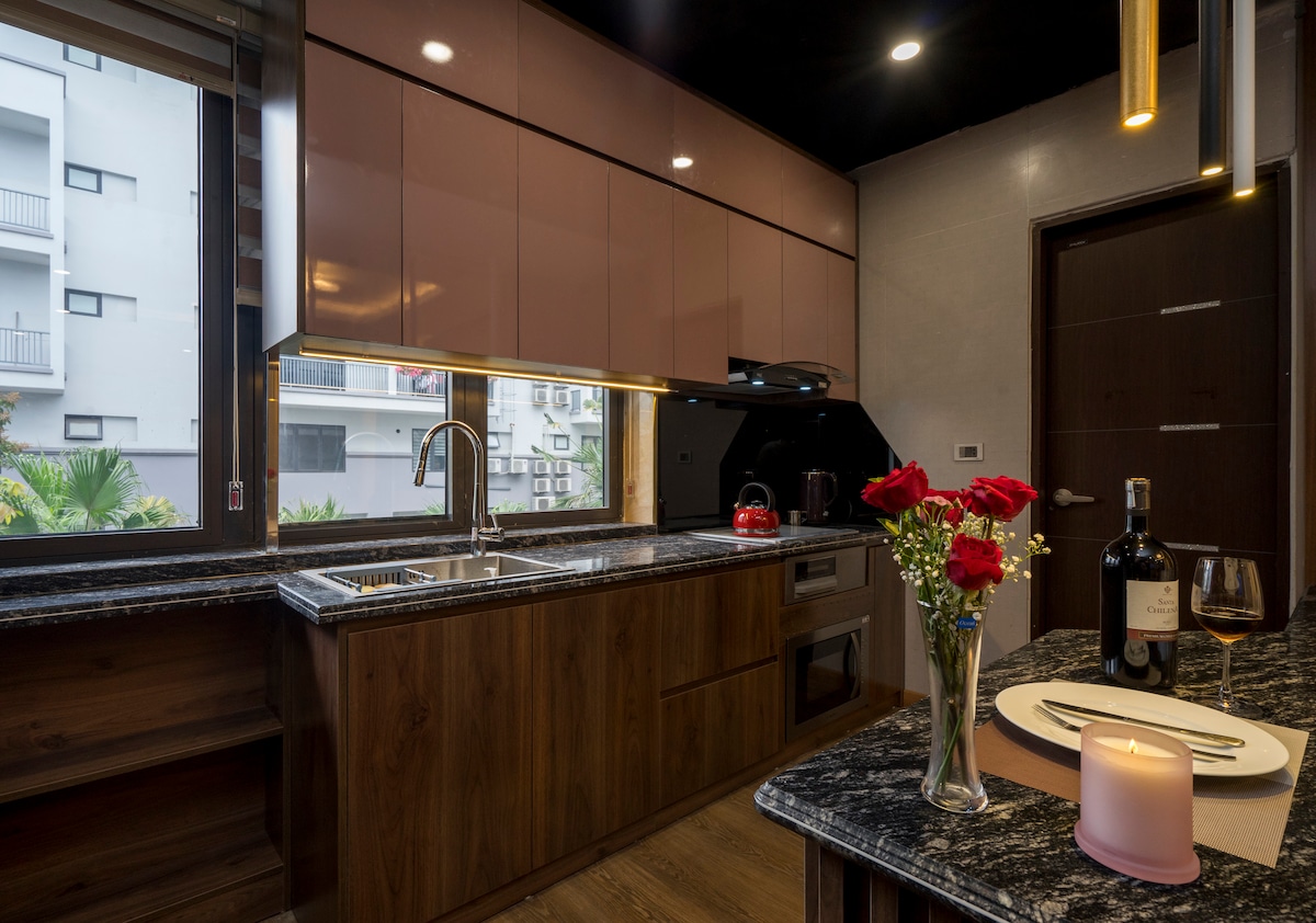 Posebna -20% popusta na promocijo za dolgotrajno bivanje: Uživajte v sproščujočem bivanju v našem sodobnem in popolnoma opremljenem studio apartmaju, ki se nahaja v prestižni soseski Alacarte Ha Long , le nekaj minut hoje od plaže. Idealno za pare, majhne družine ali poslovne popotnike. • Površina: 45 m² • Postavitev: prostorna, dobro osvetljena garsonjera s sodobno dekoracijo • Postelja: 1 zakonska postelja 1m8 • Velika steklena okna nudijo delni pogled na zaliv Ha Long Bay • Čisto, udobno in profesionalno vzdrževano