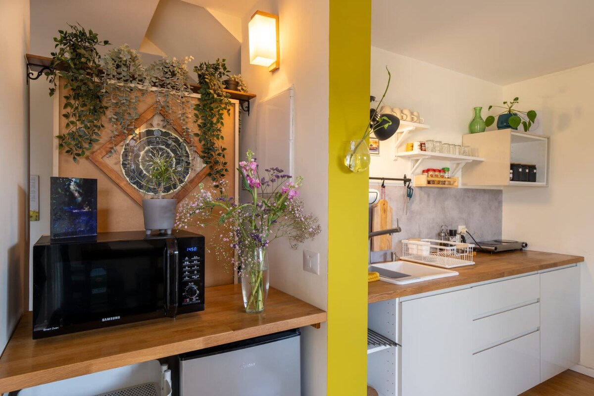 Wake up to panoramic views of Haifa Bay from your private rooftop terrace. This light-filled studio blends calm, comfort, and vintage warmth. Perfect for couples, solo travelers, visiting academics, or remote work. A quiet 4th-floor walk-up with shared walkway and laundry. Friendly hosts live below with a dog and cat who stay downstairs. Steps from local cafés and shopping and close to Talpiot Market, the Carmelit, and the Bahá’í Garden - an inspiring base for short or longer stays in Haifa.