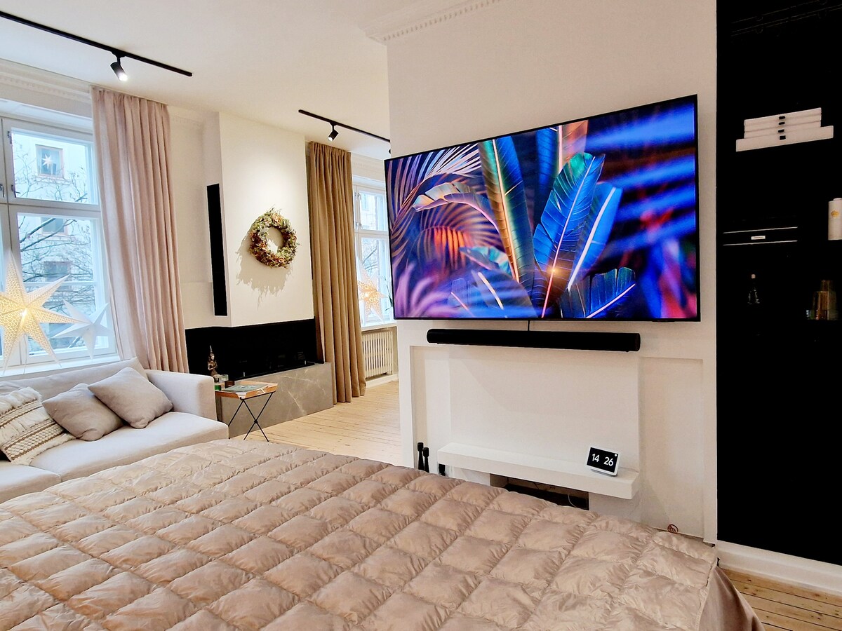 This furnished spacious studio apartment comes with warm colors and a fully equipped open layout kitchen. This studio is well suited for short and long term stays with a spacious layout, large Jugend-style windows, and plenty of closet space. Get the practical things like a fully equipped kitchen, washing machine, fast WiFi, 24/7 support, and regular professional cleaning, and fun stuff like a smart TV. Stay in comfort for as long as you’d like – days, weeks or months.