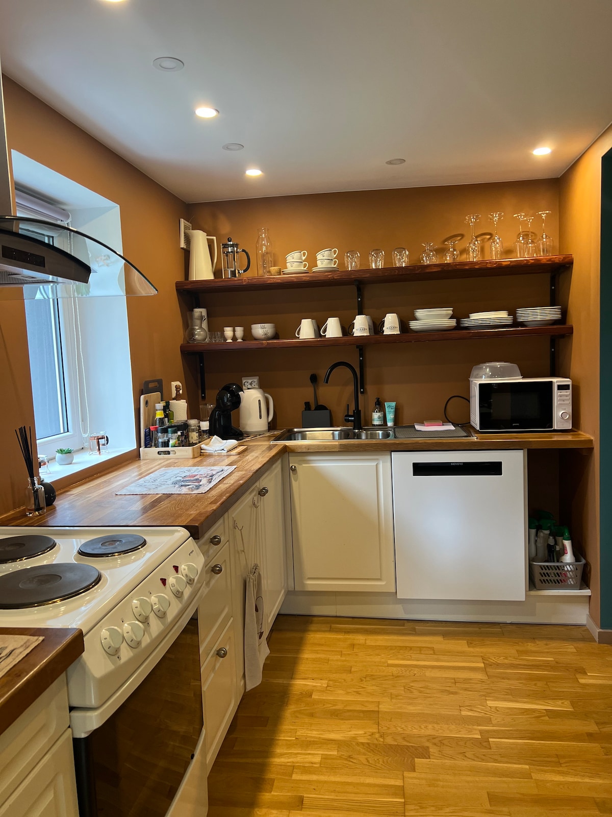 Le nekaj metrov od središča mesta, vendar zelo mirno na koncu ozke ceste, s čudovitim razgledom na fjord in gore! Vaše parkirno mesto je pred našo hišo, vi pa se spustite po zunanjem stopnišču do vhoda. Vhod ima veliko garderobo. Naslednja je sodobna in popolnoma opremljena kuhinja. Kopalnica ima kombinacijo prhe in pralnega in sušilnega stroja. Na koncu hodnika je spalnica s posteljo 150 x 200 cm in veliko omaro ter dnevna soba z raztegljivim kavčem, ki se razteza do 140 x 200 cm, in otroško posteljico. Dobrodošli!