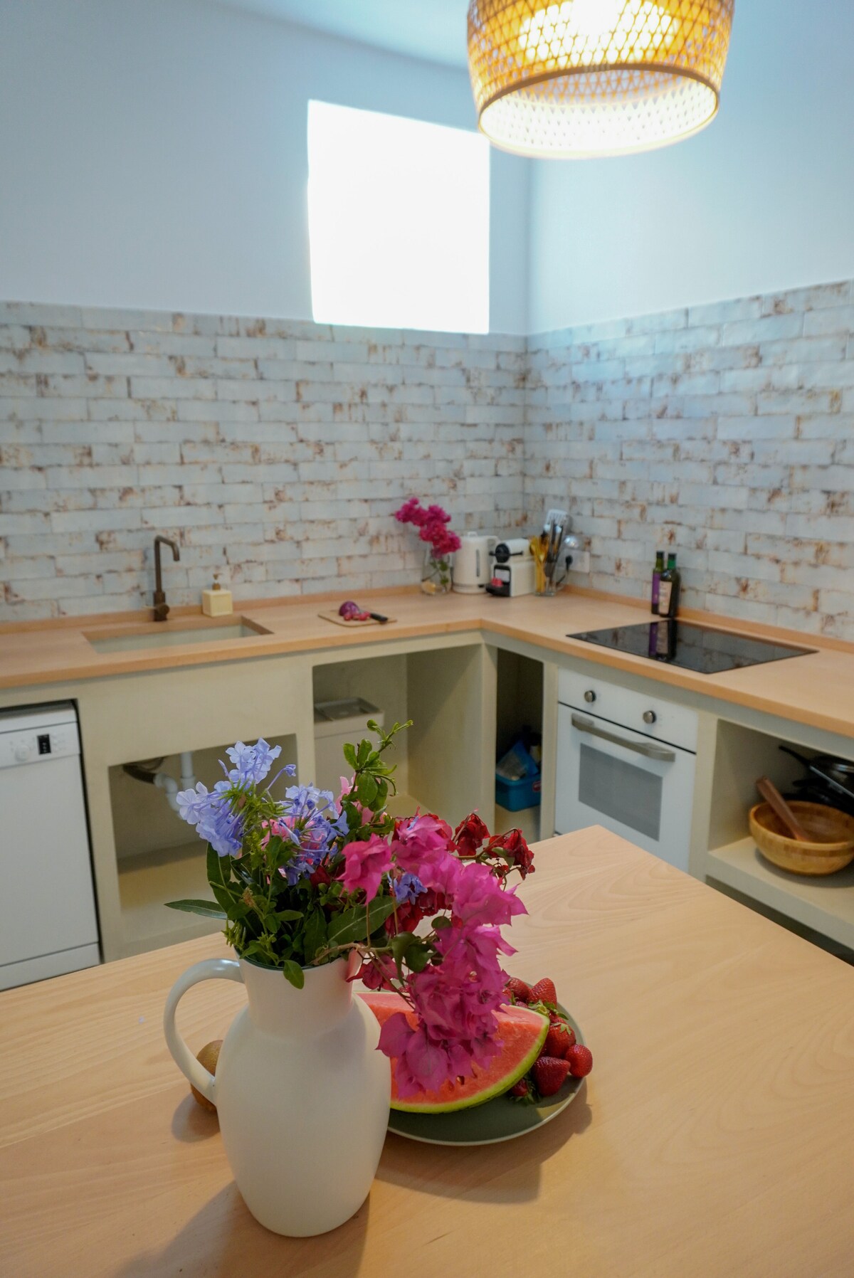 Helles Studioapartment mit Blick über das Tal bis zum Meer im gemütlichn Boho-Stil, gelegen auf den Anhöhen über dem Küstenorten Arrieta . Das Studio bietet ein französisches Doppelbett (140 cm x 200 cm), eine gemütliche Sitzecke mit lässigen Ledersofas, eine große Essecke und eine Küchenzeile mit Küchenblock der sowohl als Arbeits- als auch als Frühstückstisch dienen kann. Außerdem gibt es ein großes, helles und modernes Badezimmer mit begehbarer Dusche und eine große, möblierte Terrasse.