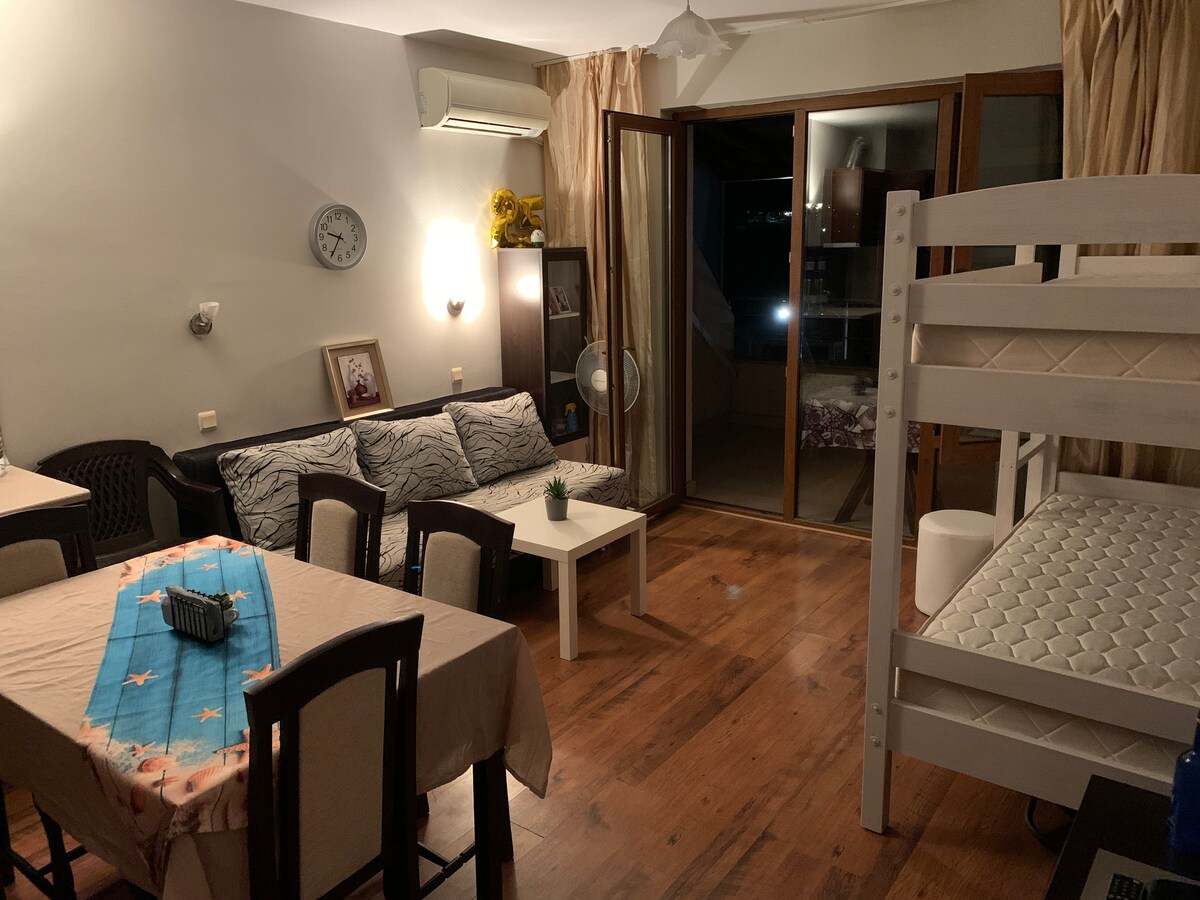 Stanovanje 55m ² v kompleksu 100 metrov od morja. V njem boste našli vse, kar potrebujete za počitnice ali konec tedna. Velika dnevna soba z raztegljivim kavčem in velikim balkonom, spalnica s prostorno posteljo in popolnoma opremljena kuhinja. Dve plaži ( Harmani in Budjaka\Bambu )sta oddaljeni minuto hoje, Lidl je oddaljen 5 minut, trgovina s češnjami je oddaljena 1 minuto, več restavracij pa je oddaljeno minuto hoje. Do starega mestnega jedra Sozopola lahko pridete v 20 minutah. Kompleks ima pokrito brezplačno parkiranje in prostor za žar.