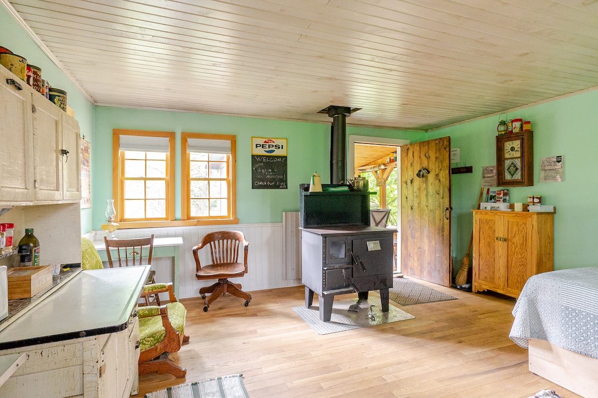 - private, secluded, off-grid cabin with screened-in porch - nestled in the trees on the banks of a small stream - vintage vibe - no running water or electricity, bathroom is an outdoor dry toilet + seasonal shower - SHOWER CLOSED Rustic one-room cabin with wood stove. Cozy retreat offering simple living, intimate connection to nature. Perfect for those seeking quiet, unplugged experience away from modern distractions. Cook on an outdoor kitchen with BBQ + burners. Campfire wood available.