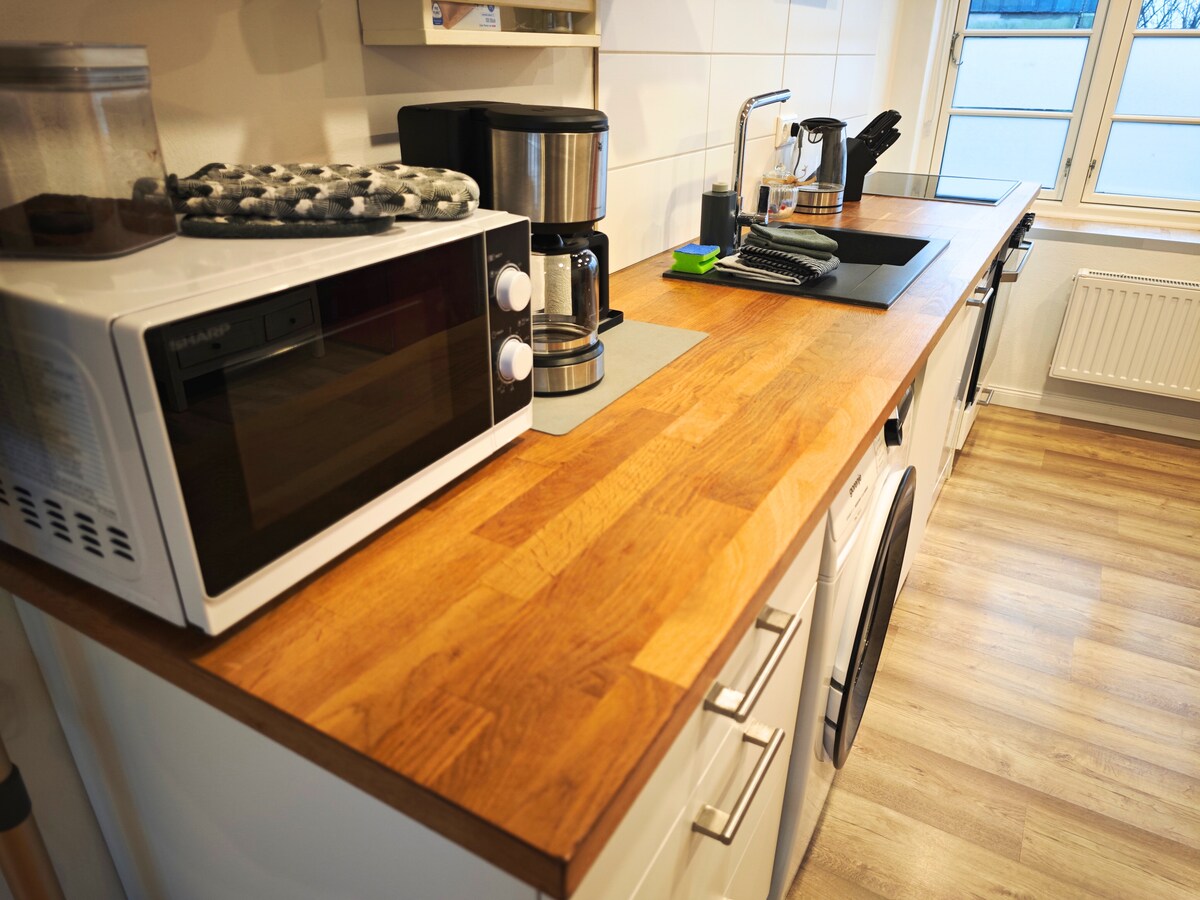 Naša 35 m² velika garsonjera, prenovljena leta 2025, ponuja posteljo 180×200 cm, popolnoma opremljeno kuhinjo, jedilno mizo in udoben prostor za sedenje z vrtljivo televizijo. Sodobna kopalnica s prho/talnim ogrevanjem in teraso zagotavljata udobje. Na hodniku je garderobna omara, omara, stojala za čevlje. Kolesa/e-kolesa so lahko parkirana/naložena v skednju. Posteljnina, brisače in kuhinjski paket, vklj. Psi na zahtevo (+ 25 €). Več o »Kleine Deichhof«, zgrajenem leta 1867. Medien @ kleine_deichhof.