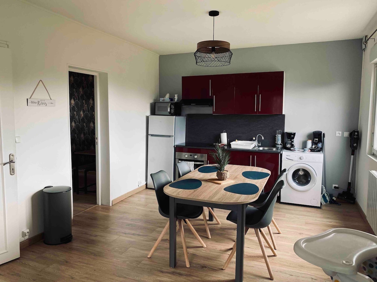 Offrez-vous un séjour relaxant dans ce logement calme et élégant à la campagne ! Profitez d’un salon cosy, d’une cuisine ouverte équipée, de deux chambres décorées avec soin et d’une salle de bain fonctionnelle. Linge de lit et serviettes fournis. Petite cour privative avec barbecue. Commerces à proximité, centre équestre à 10 km, parking gratuit. Réservez vite !