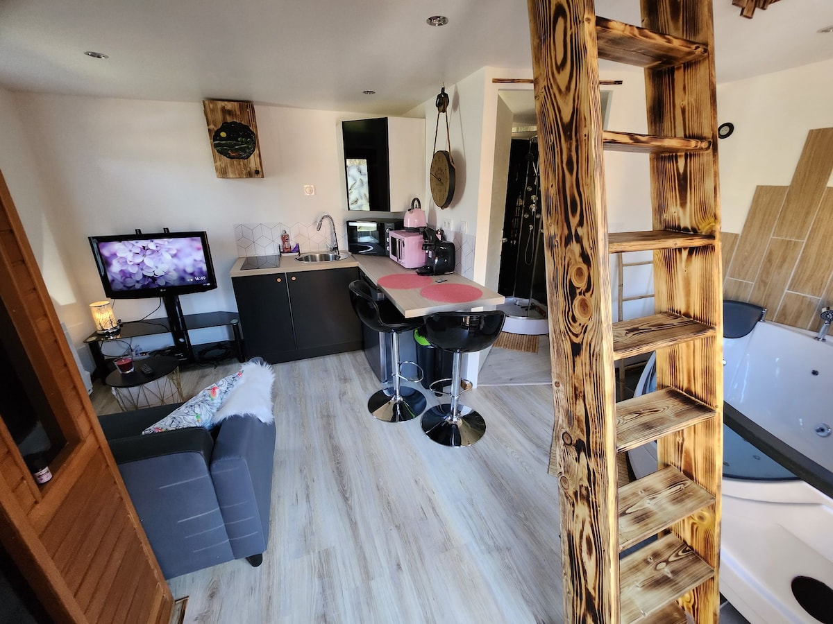 Love room 55m² en duplex avec accès illimité à l'espace bien être privatif. Située en Haute-Saône à 10 minutes de la Haute Marne et des Vosges, profitez du calme de la campagne et découvrez notre belle région... Relaxation, détente et bien-être sont les maîtres mots de notre espace cocooning. Évadez vous sous le ciel étoilé, relaxez vous dans un véritable spa au pied du lit, profitez de la chaleur du hammam ou du sauna. Le gîte dispose aussi d'une cuisine équipée,un salon,sdb, wc et terrasse...