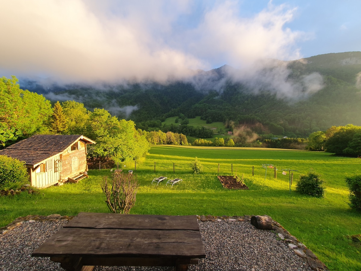 Lesena mini-hiška, vse je bilo ročno izdelano, od konstrukcije do pohištva, z veliko predelanih materialov. Očarljiv, veličasten razgled na gore, na polju, z velikim kavčem,pisalno mizo, veliko kuhinjo, kopalnico, mezzanine s posteljo in mrežo za odhod na teraso, na strehi hiše. Nordijska kopalnica/jacuzzi ni vključena v ceno nočitve. 25 minut od Annecyja 20 min od Aix les Bains 8 min od gorovja de cessens s čudovitim razgledom na jezero Aix
