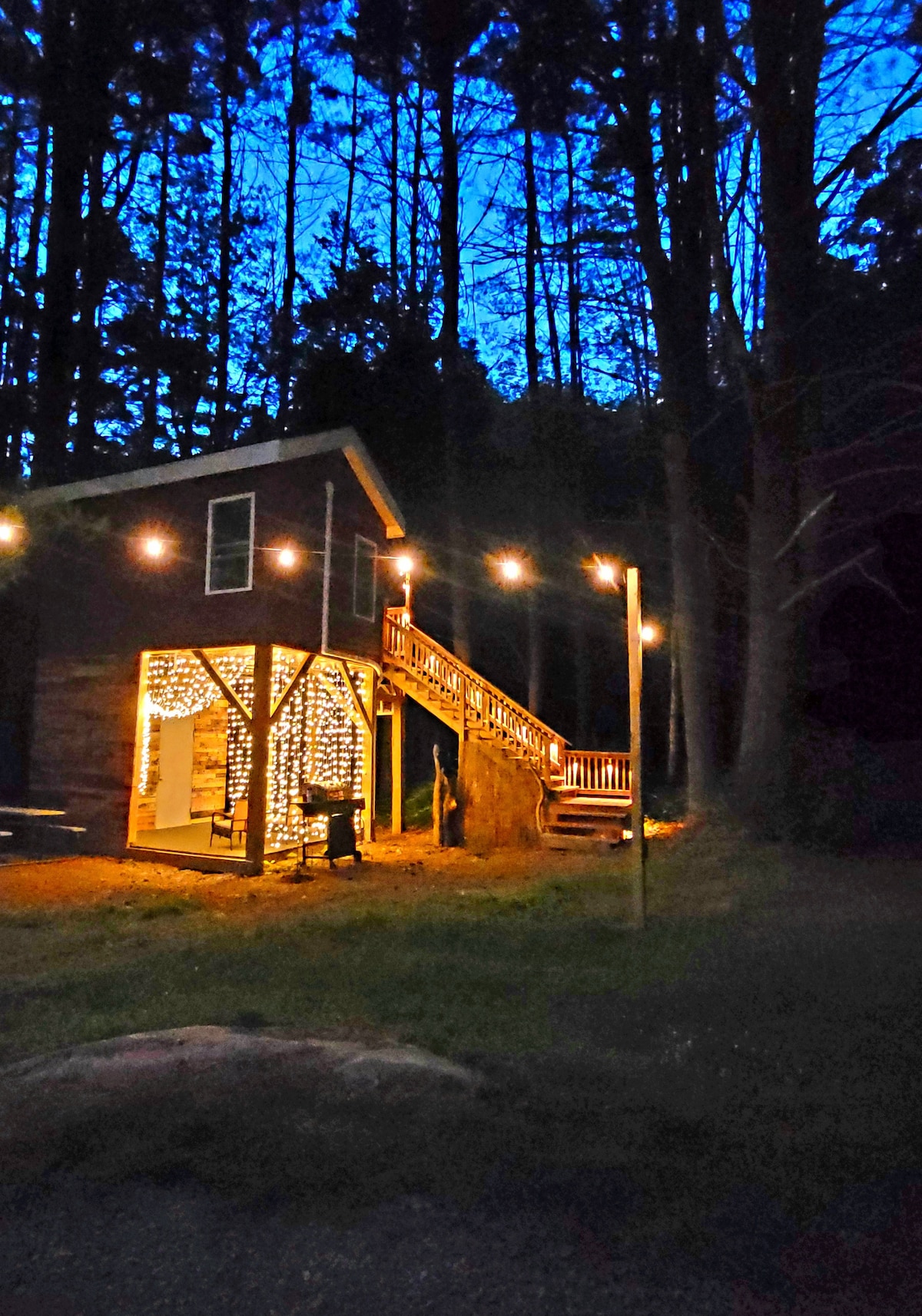 Dobrodošli v kampu Treetop Getaways Luxury Treehouse Campground! Mi smo edini te vrste! Uživajte v noči na drevesih v tej čudoviti samostoječi hišici na drevesu. Ta čudovita 200 kvadratnih metrov velika rustikalna koča v zraku ima vse, kar si lahko kadarkoli zaželite od počitnic, vključno z raztegljivim kavčem in običajno posteljo, toplo in hladno tekočo vodo, običajnim straniščem, vsem, kar potrebujete za kuhanje, Wi-Fi, TV in najbolj udobno posteljo, v kateri ste kdaj spali.