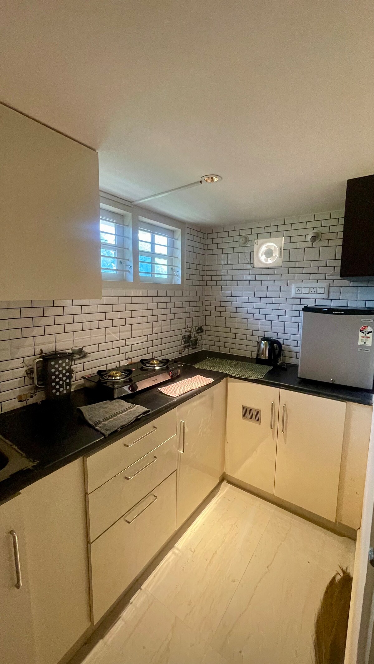 Relax with the whole family at this peaceful place to stay. a better choice for quick stays. have all the amenities required for the couples & elders. equipped with dedicated work table facility. equipped with seperate dinning/tea table for 2. wake fit queen size bed for comfort & relaxed sleep. bed spreads, pillow covers are hygienic & washed on daily basis. kitchen is equipped with basic cooking tools & utensils. additional items are available on request. geyser facility in the bathroom.