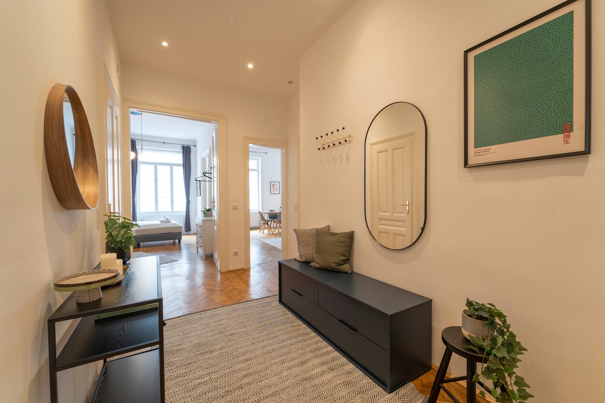 Dve na novo pokriti, povezani stanovanji, 130 m2, v osrčju središča mesta, nasuprot Akademiji lepih umetnosti /Semper Depota, le nekaj minut hoje do Mariahilfer Strasse, Secession, Naschmarkt, TU in državne opere. Stanovanja se nahajajo v dveh nadstropjih in lahko udobno sprejmejo do 8 ljudi. Vsako stanovanje ima svojo edinstveno osebnost; eno živahno dvignjeno, drugo pa s sproščeno eleganco intimnega oddiha sredi živahnega življenja dunajskega mestnega središča.