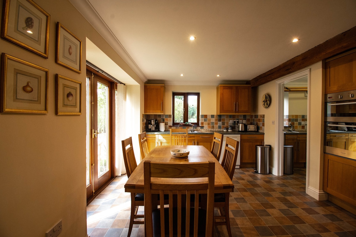 Kiln Cottage vam omogoča, da se potopite v zatočišče prostoživečih živali in miru, obdano s čudovitim podeželjem. Nahaja se v sklopu našega doma iz 17. stoletja in je zasebno zatočišče z visokokakovostnim dekorjem in vsemi sodobnimi objekti. Zbudite se ob zvoku ptičjega petja, medtem ko uživate v lokalni obrtniški kavi in pridelkih. Ta velik obokan prostor ima odprt prostor za sedenje in jedilnico z ločeno popolnoma opremljeno kuhinjo, kopalnico in dvema razkošnima dvoposteljnima spalnicama.