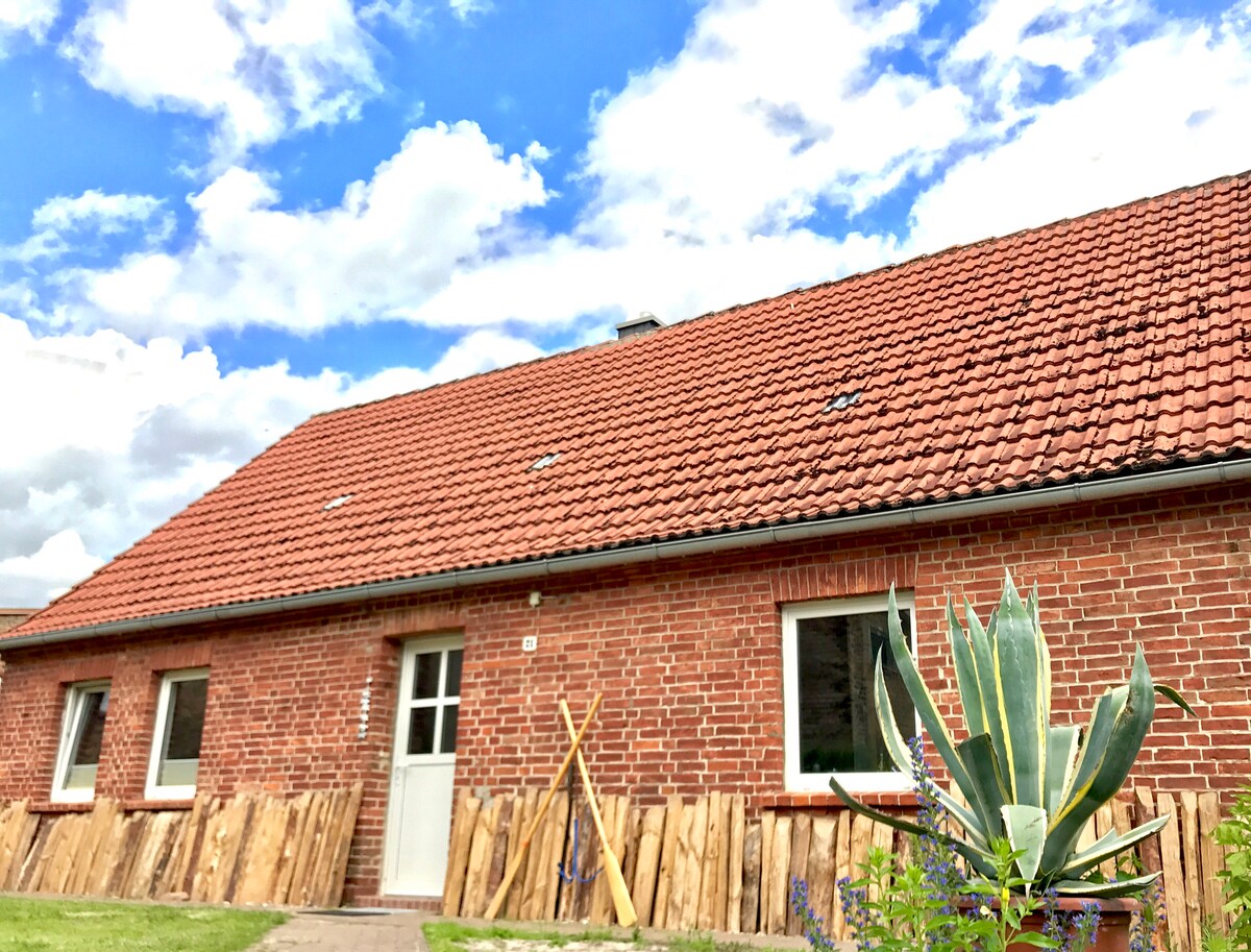 Na novo prenovljena opečnata stavba (s talnim ogrevanjem) brez ovir (s talnim ogrevanjem) z 2 apartmajema, ki je idealna za kolesarjenje, pohodništvo in sprostitev, obdana s širokimi polji in cvetočimi travniki, le 600 metrov od počitniške hiše vabi Zarow k ribolovu! Za hiško na deželi je dovolj prostora na 700 kvadratnih metrih. Velik travnik za sprostitev ali celo za otroke do vijaka. Šotor lahko postavite brezplačno. Na voljo sta travnik in terasa za vsako stanovanje ločeno za peko na žaru in sedenje.