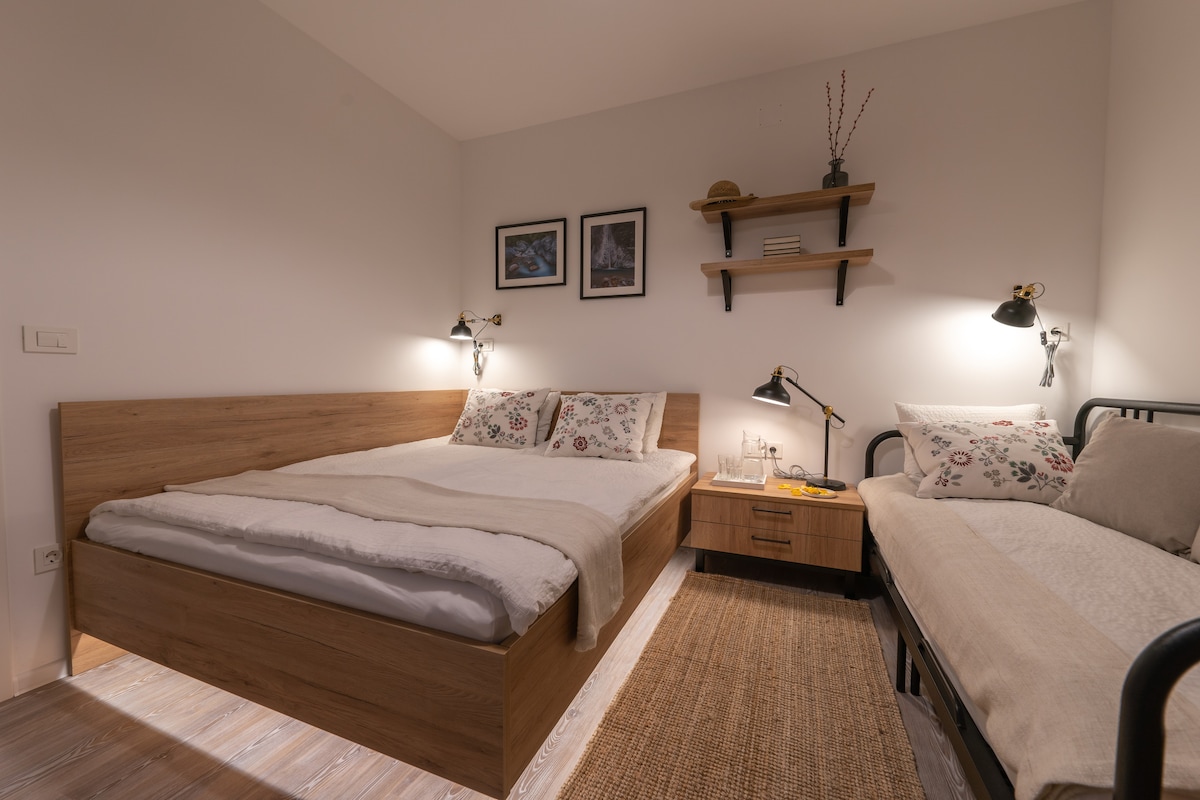 Welcome to home rental Apartments Wallas Bovec. Our residence includes 3 apartments. The rooftop apartment is the best one and it includes 2 bedrooms, living room, private bathroom and a well equipped kitchen (fridge, oven, toaster, electric kettle, coffee machine and dishwasher). The apartment is close to Soca river, Triglav National Park and has a beautiful view of the Julian Alps
