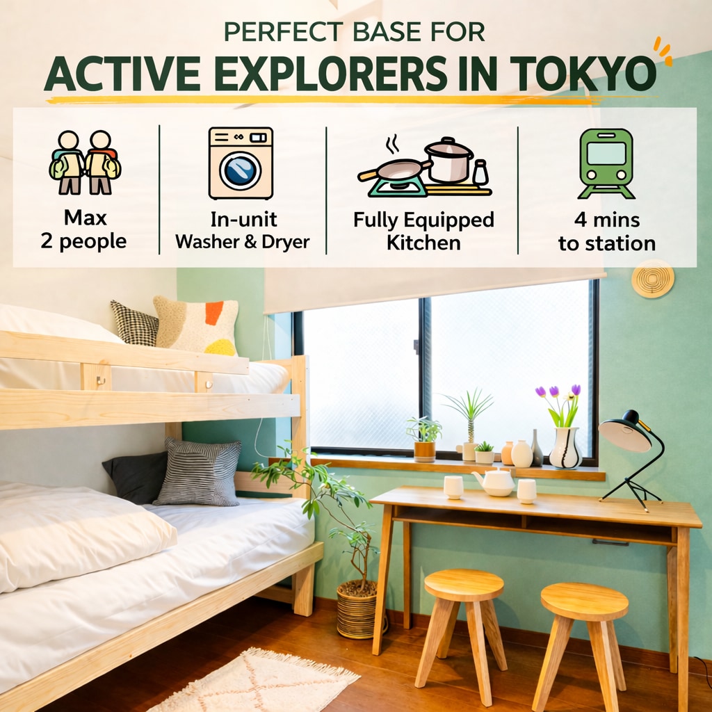 🏠 Prostorna suita s slogom (75 ⓘ +) Nahaja se na 4F v vili z dvigalom, ki je obrnjena proti jugu. Ima širok balkon, sodobno japonsko notranjost, nove naprave in pametno ključavnico. 🚉 Odličen dostop 5 minut do Shinjukuja, 2 minuti do podzemne železnice. Enostaven dostop do mesta, letališča in trgovin. Ključna mesta v 30 minutah. ☕ Kavarna in bar na 1F Pijača in obroki, vključno z dim sumom, testeninami, riževimi posodami. 🎉 Gostje prejmejo 5% popusta. 🛒 Priročnost v bližini 4×24-URNE trgovine, vklj. FamilyMart in Lawson 100. 🛍️ Trgovine v bližini V bližini vrha, ŽIVLJENJA, trgovin z živili in drogerij.