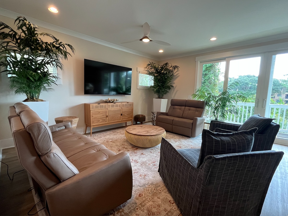 Dobrodošli v svojem zasebnem koščku raja Hilton Head - popolnoma obnovljen in le nekaj korakov stran od peska. Ta 4BR, 3,5BA showstopper se nahaja na vogalnem zemljišču, 10 metrov od zasebne plažne poti. Uživajte v tropskem bazenu, ognjišču, zunanji prhi in ogromnem balkonu s pogledom na to oazo ob plaži. Notranjost: dva elegantna bivalna prostora, pametni televizorji v vsaki sobi in luksuzni prostori. Za 11 oseb in psom prijazno. Minute od vrhunskega golfa, obedovanja in neskončnih otoških pustolovščin - rezervirajte svoje sanjsko bivanje zdaj!