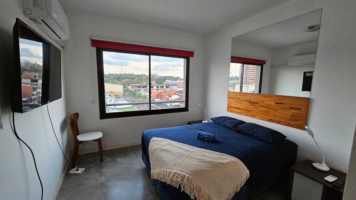 Odlična lokacija v središču Puerto Iguazúja, na aveniji Victoria Aguirre, 50 metrov od glavnega trga in nekaj korakov od barov, restavracij in regionalnih trgovin. Čudovit razgled na mesto, v mirnem predelu s hitrim dostopom do turističnih znamenitosti, mednarodnega letališča (21 km), igralnice Iguazu (2,6 km) in Duty Free Shop (3,6 km). Prostorne sobe s klimatsko napravo, dnevna soba/jedilnica s TV/Wi-Fi, opremljena kuhinja in balkon z žarom.