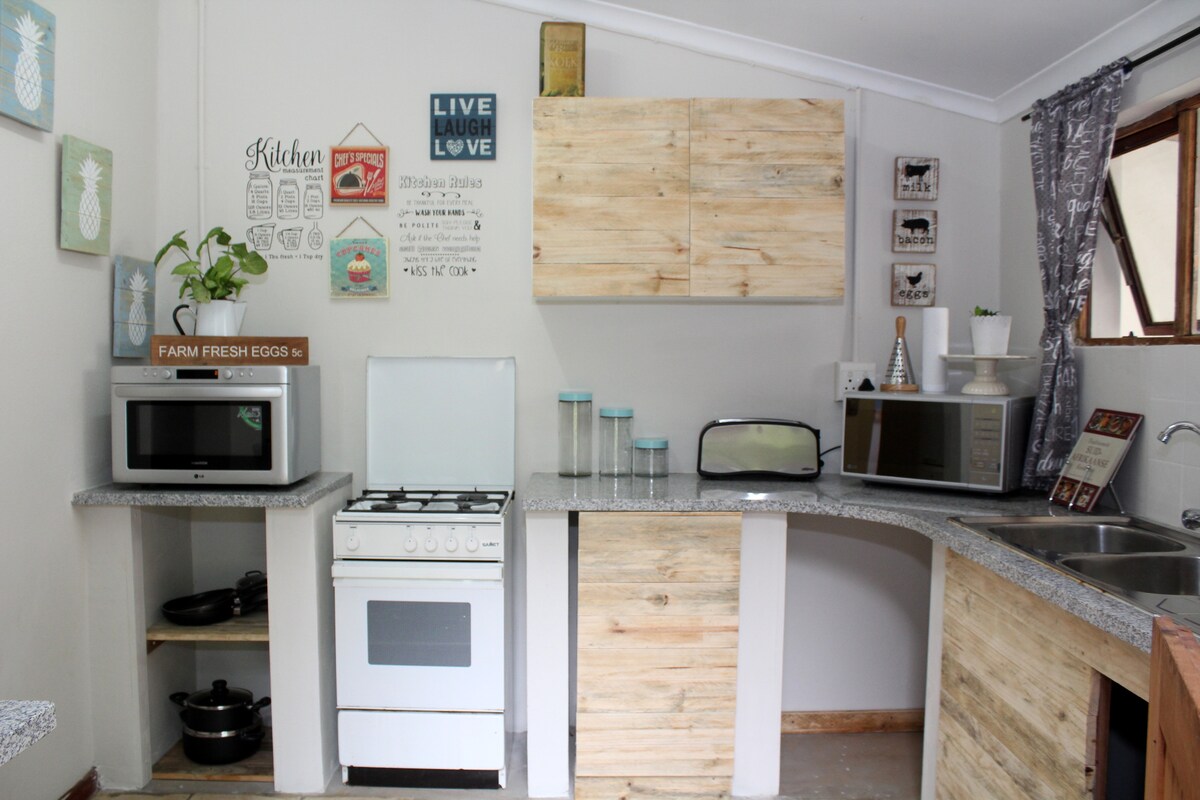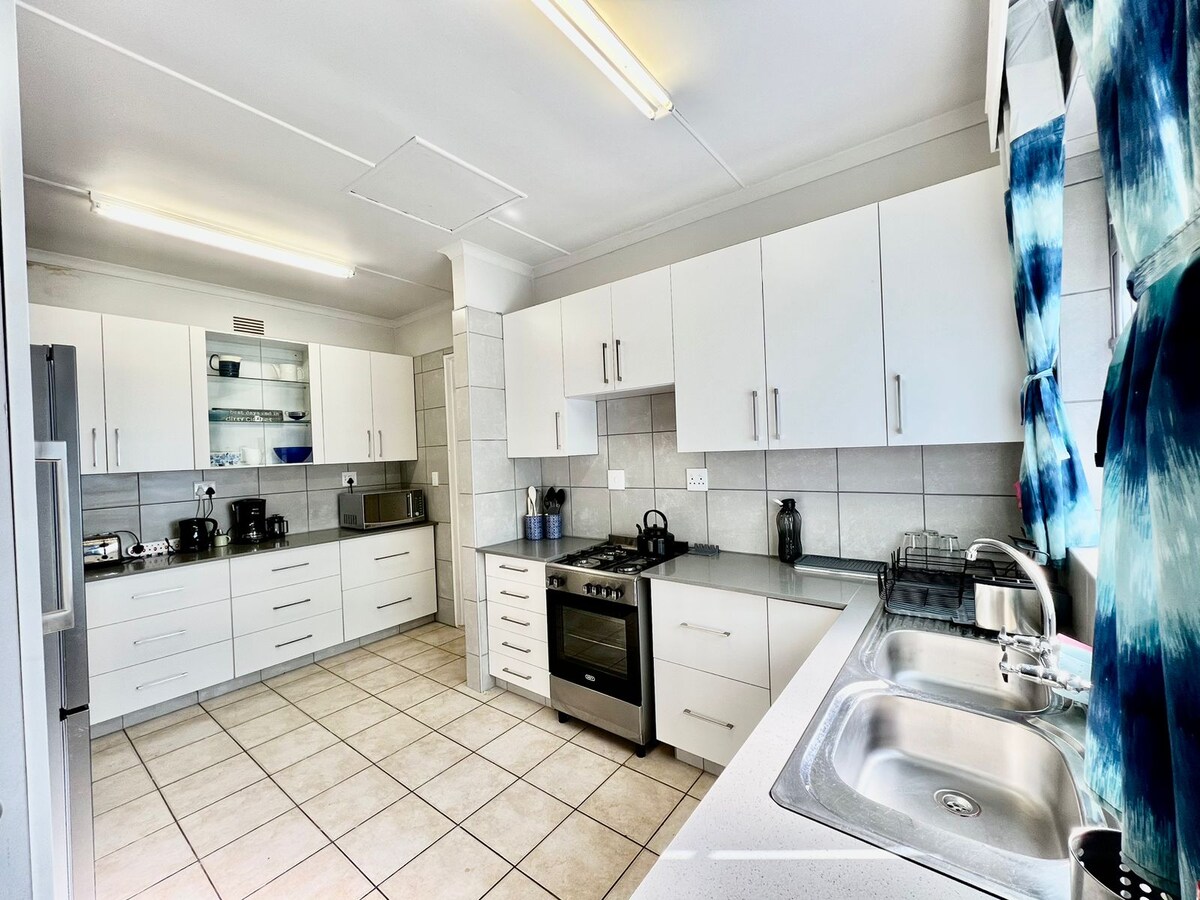 The spacious self catering cottage has 2 ensuite airconditioned bedrooms with luxury linen and bath towels. The bathrooms, tho dated, are clean and tidy. Our commitment to being as Eco friendly as possible, linen is washed but not ironed. Our coffee bar is stocked with homemade rusks, coffee, tea, and sugar. There is also milk in the fridge. The lounge and patio area have beautiful views of the Falsebay Lake. The kitchen is fully equipped. Quoted rate is for up to 2 people, the unit can sleep 4.