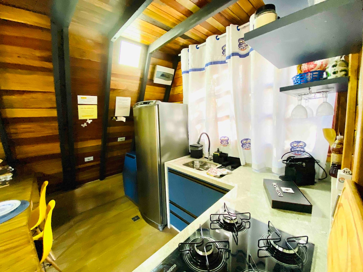 40m² Zidarski planinski dom; 1 spalnica 9 m²; dvojna postelja; 21-palčni televizor (LED); požarna palica, DVD;stropni ventilator; dnevna soba; mini opremljena kuhinja (krožniki, kozarci in pripomočki); mikrovalovna pečica; mini hladilnik; aparat za kavo; aparat za sendviče; električni štedilnik 2 gorilnika;kamin; 10 m² balkon; ima 2 osebi. V sklopu namestitve so igralnica, dnevna soba, dnevna soba, bazen, poti, masaža, jezero za športni ribolov, skupna kuhinja, viseča mreža, narava ob vznožju Serra da Mantiqueira.
