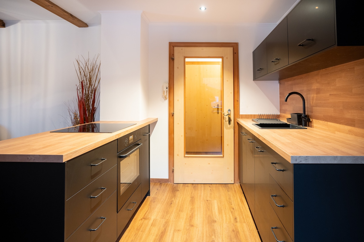 Udobno stanovanje za največ 4 osebe z veliko teraso za sončenje in čudovitim razgledom na gore. Popolnoma opremljena kuhinja, sodobna kopalnica, pametni televizorji in brezplačno parkirišče. Posebnost: masažna kad na terasi (na zahtevo, za doplačilo). Odlična lokacija za smučanje, pohodništvo in izlete. Telovadnica je vključena!