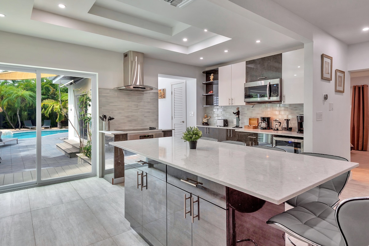 Novogradnja, 5 minut do Las Olas Boulevard, sodoben letoviški slog. 3 spalnice, 3 kopalnice. 20-palčni stropi z velikimi okni, ki omogočajo veliko naravne svetlobe v hiši. Steklena zaprta vinska soba, odprt koncept bivanja, osredotočen na pravo kuharsko kuhinjo, vrhunski aparati, vključno z dvojno pečico. Zasebni balkon s pogledom na dvorišče in ogrevan bazen, ležalniki, vgrajen žar, 2 ločeni garaži za avtomobile.