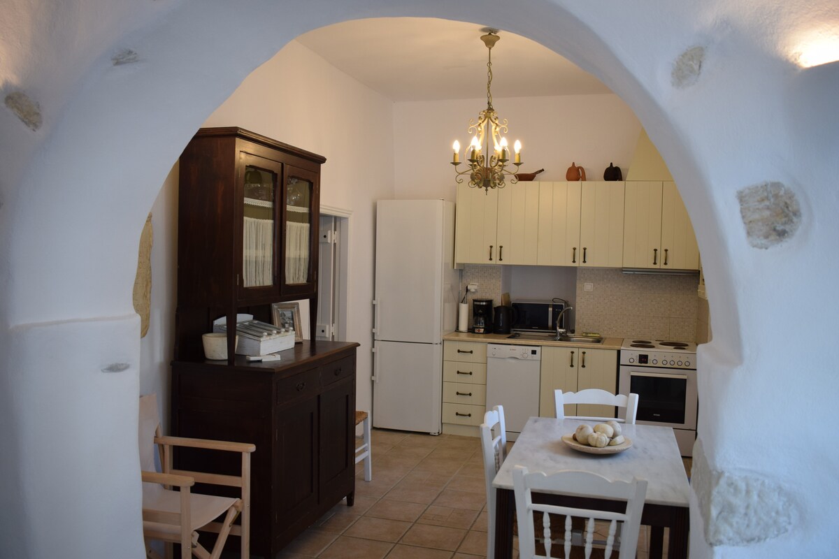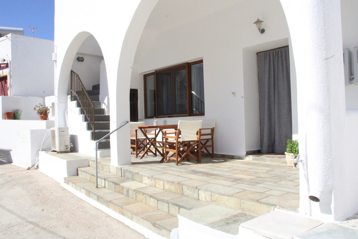 Pritličje stanovanje tradicionalnega cikladskega sloga, v osrčju naselja Parikia. Idealno se nahaja, ponuja mir in sprostitev ter priročno osrednjo lokacijo. Peš: vse zanimive znamenitosti (stara tržnica, frankovski grad), pekarna, trgovine. Morje je od hiše oddaljeno nekaj metrov, v 2 minutah pa lahko pridete do ulice ob morju, kjer lahko uživate v pogledu na sončni zahod. Pristanišče, avtobusna postaja in taksi postaja so oddaljeni 3 minute peš.
