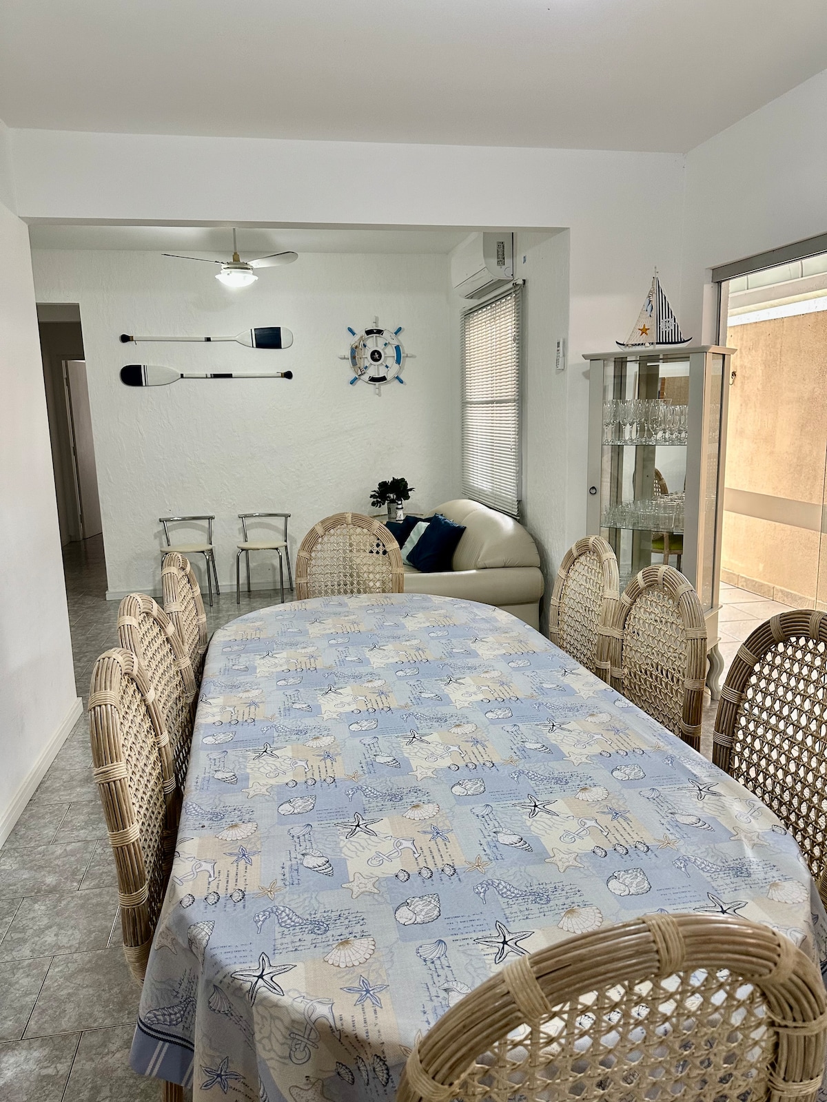 Dvosobno stanovanje je 50 m² v spalnici. Hladna klimatska naprava v vsaki sobi in Wi-Fi. Prostor za dve okolici: Hladilnik, indukcijska kuhalna plošča, vodni filter, TV 42. Suita; zakonska postelja. Četrtič: Zakonska postelja in pograd. Brezskrbnost za tiste z otroki, vsa okna so zaščitena, stanovanje v drugem nadstropju brez dvigala. *Ne nudi posteljnine, na voljo so samo blazine za plažo s 4 stoli. *Vnaprej preverite zneske za posteljnino in brisače.