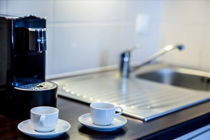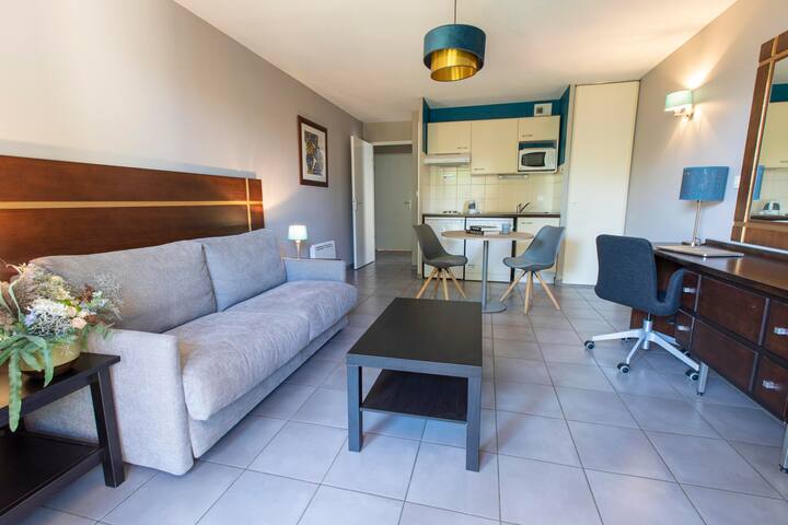 - Kitchenette équipée (espace repas, plaques de cuisson, réfrigérateur, lave-vaisselle et four à micro-ondes)