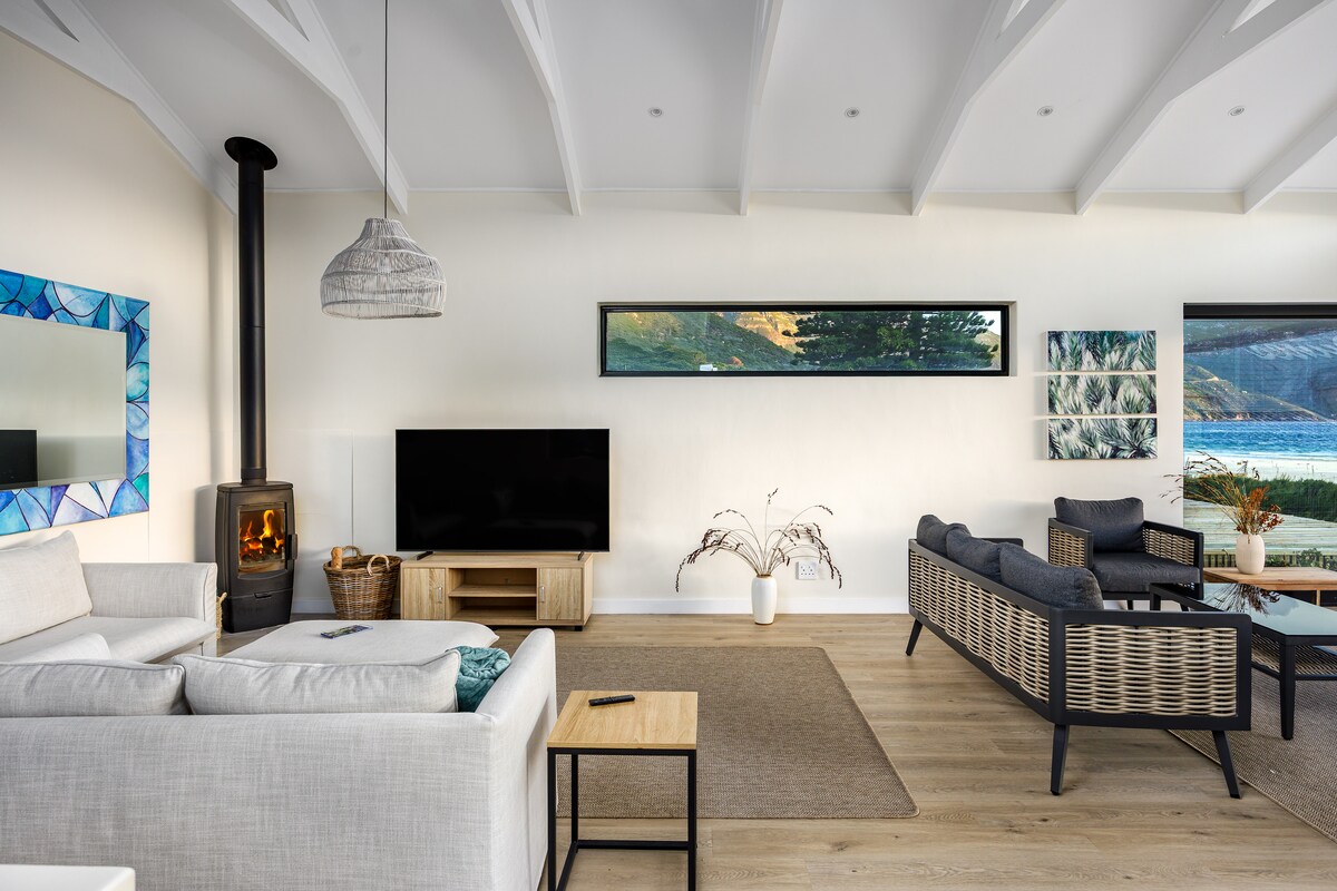 Stay here and enjoy stunning sea views, peaceful nature and a refined yet homely interior. Watch glowing sunsets or passing whales and dolphins and the romantic mist over the cliffs with the sound of waves as your constant backdrop. Relax by the fireplace in the spacious double‑storey lounge, cook in the fully equipped open‑plan kitchen and work with fast fibre and a “ready‑to‑plug‑in” office setup. Please do read the important info about steep stairs to the house and additional points below.