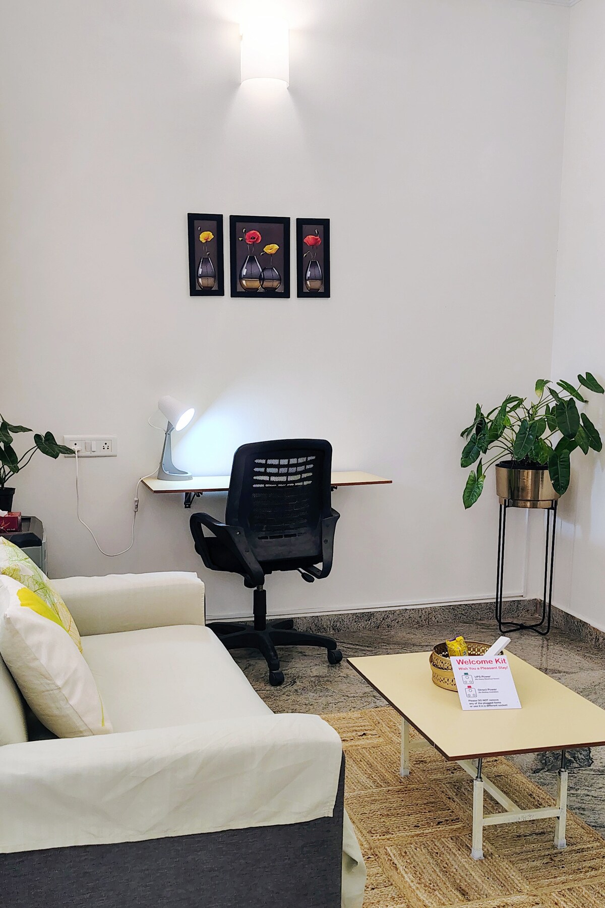 Experience a homely stay in this fully furnished, spacious 1BHK BnB set in a very posh and peaceful neighborhood. Surrounded by greenery, the home is bright, airy, and well-ventilated with modern amenities and elegant interiors. Just a 2-minute walk from the main market street and popular cafés, it offers the perfect balance of serenity and city life. Located on the 1st floor with easy access, ideal for leisure or business stays.