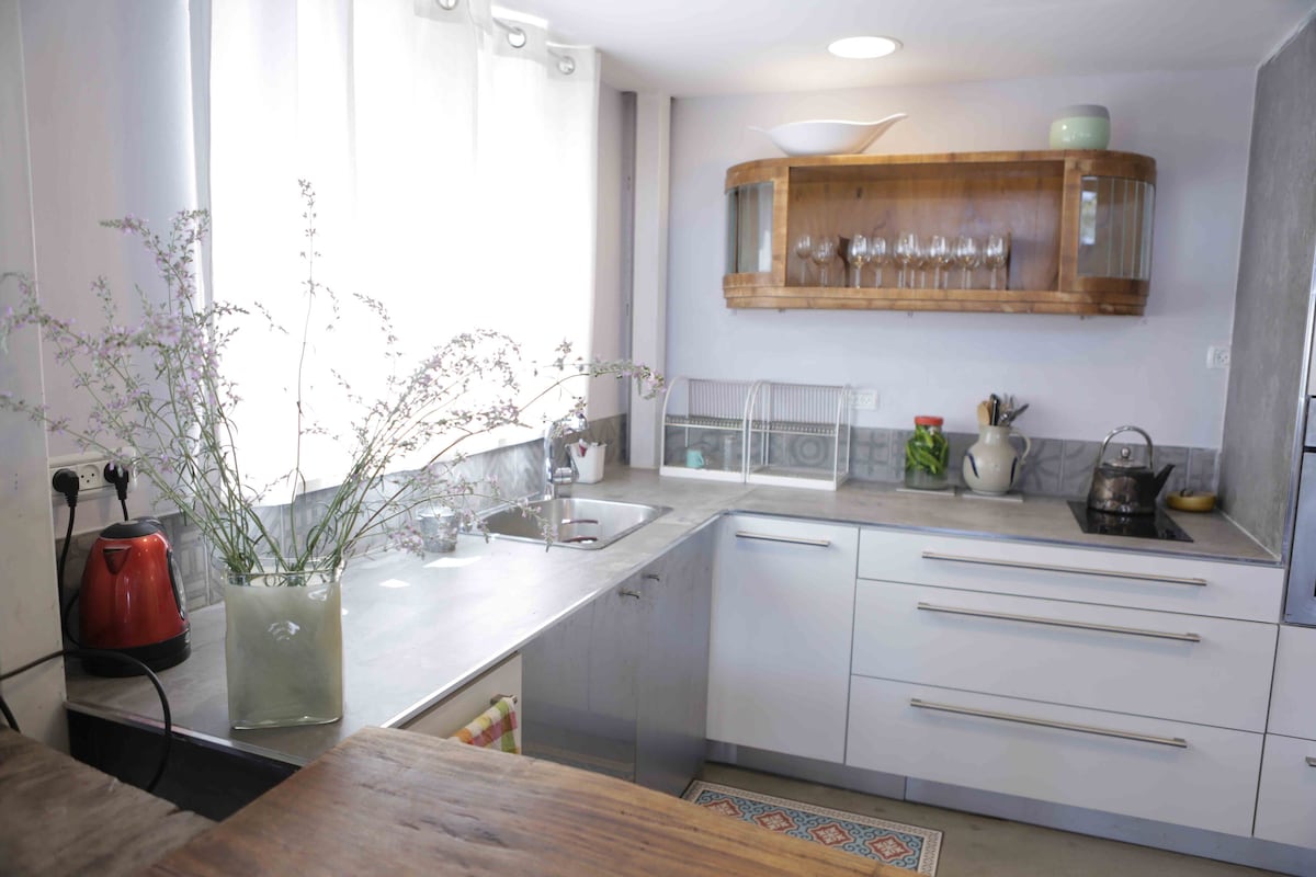 A 140 mr unique colorful mountain top villa surrounded by nature with panoramic breath taking view, 30 minutes from the Galilee Sea, Aco ,Nazarha Zafat. Fully furnished Lower level including a living room with cozy fire place and comfortable sitting area. Spacious upper level gallery sleeps 13 people comfortably in an open space. You can enjoy 60 meters of a private beautiful luscious garden. A peaceful atmosphere that is perfect for friends gathering or family vacation. workshops available.