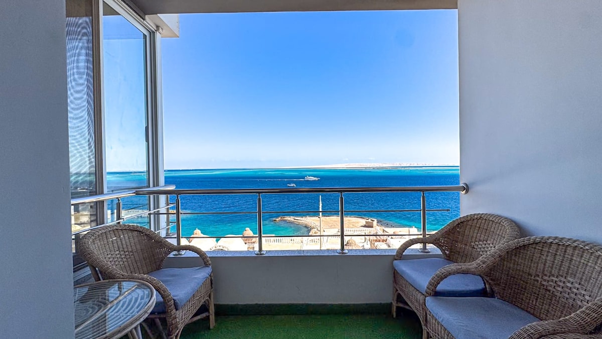 Hurghada holidays - enjoy your stay in modern, beach front, super spacious 90 sqm 1BR apartment with open plan kitchen and living area, fully furnished with all essentials for your comfortable stay in Hurghada. Big balcony give you the best direct sea/pool views and is ideal place to watch a magical sunrise. Private beach, sun beds, two big swimming pools, green garden, Wifi 4G internet, 24 /7 security and outdoor parking are included. **Price not included bills for water and electricity.