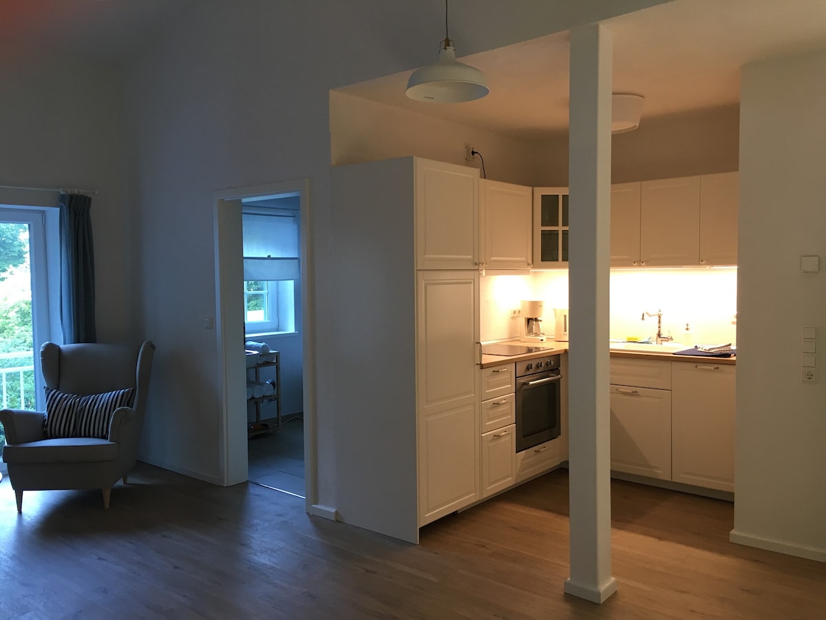 To 40 m2 veliko stanovanje se nahaja v bližini pristanišča Flensburg in središča mesta ter vas vabi, da združite zgodovinski pridih starega mlina na veter s sodobnim bivalnim udobjem. Trdni leseni tramovi oživljajo zgodovino, sodobna dekoracija v skandinavskem slogu pa vam omogoča udobno bivanje. Raziščite središče Flensburga, doživite peščene plaže in kolesarske poti ob obali Baltskega morja ali pa se odpravite na izlet na bližnjo Dansko.