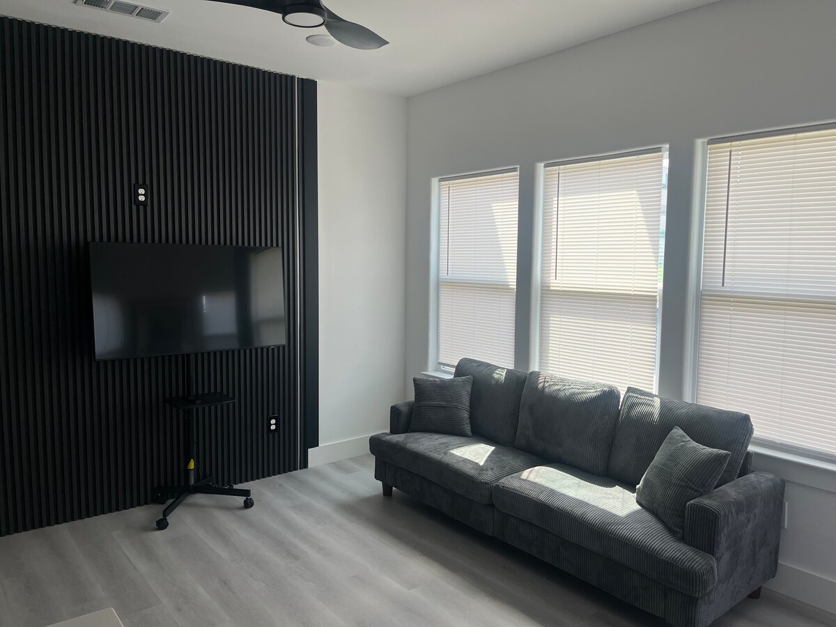 Čudovito prenočišče je opremljeno s centralno klimatsko napravo in ogrevanjem, pralnim strojem, sušilnim strojem, hladilnikom, pomivalnim strojem in štedilnikom za kuhanje. Na voljo sta tudi dva 70-palčna in 65-palčna televizorja ter 30-palčni televizor. Brezplačen kabelski spekter Prenočišče ima dve kopalnici in dve spalnici. Glavna spalnica vključuje zakonsko posteljo, dodatno zakonsko posteljo in raztegljiv kavč. Hiša je varovana z varnostnim sistemom ADT, na vhodu pa sta kamera na zvoncu in pametna ključavnica za samostojen vstop.