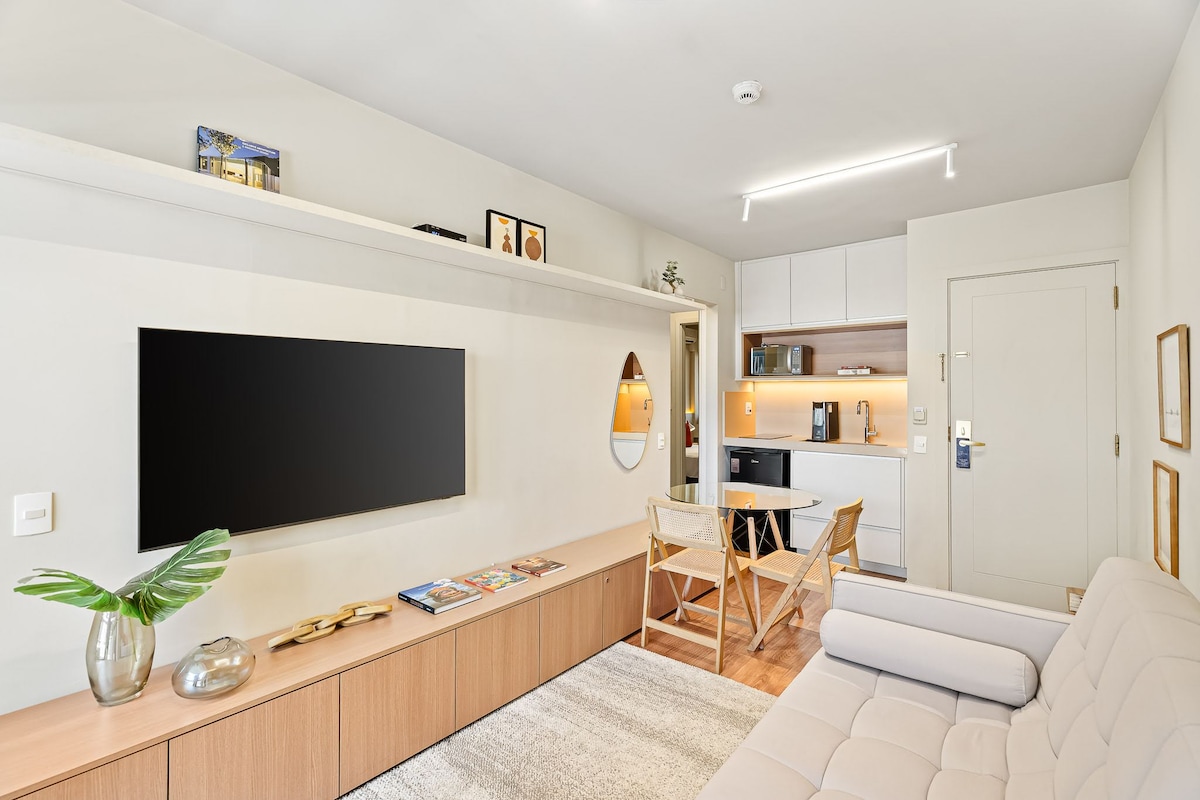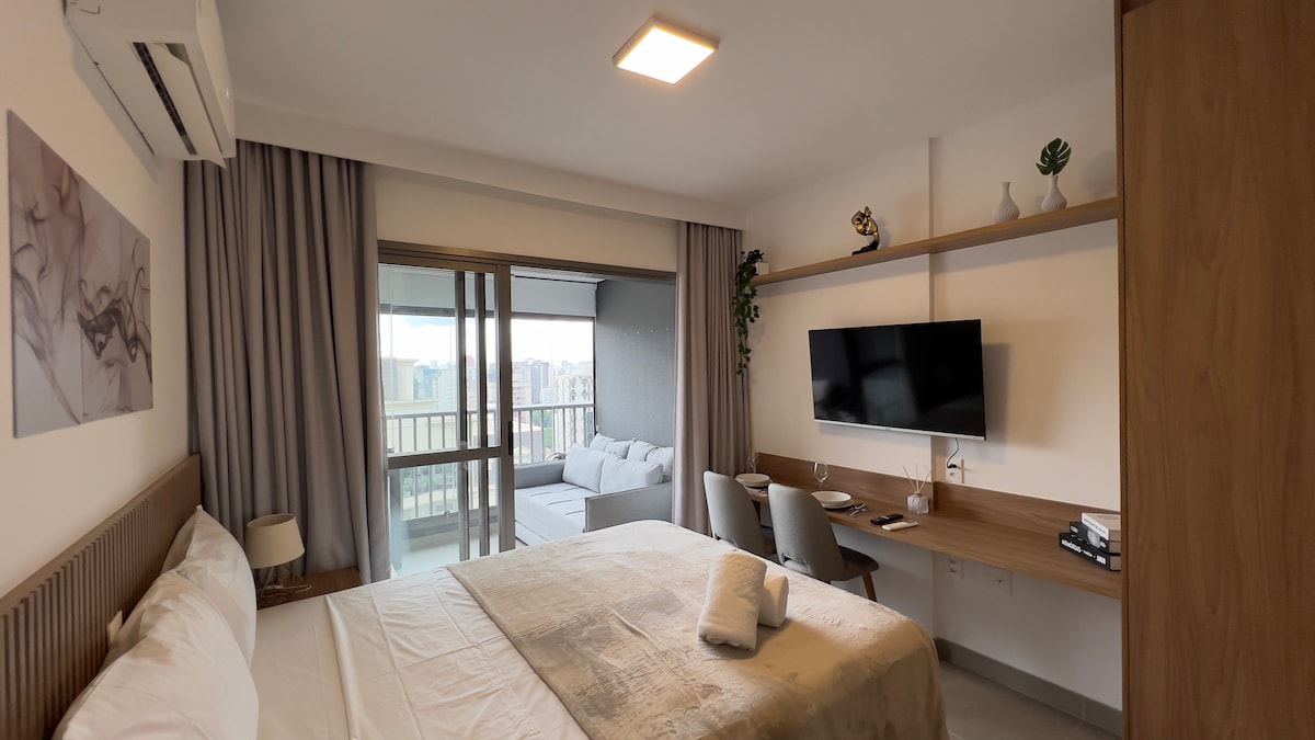 Garsonjera v bližini Pq Ibirapuera s sodobnim dekorjem, vgrajeno LED osvetlitvijo, ki zagotavlja udobje in dobro počutje. Vrata z elektronsko ključavnico, klimatsko napravo in zavesami z zatemnitvijo. 24-urni vratar Majhna in gozdnata ulica Wi-Fi, bazen, savna, telovadnica, stojalo za kolesa Ločena izlivna pipa s filtrirano vodo Vzmetnica (par) Simmons s skrinjo Delovni predsednik Herman Miller Smart TV Samsung 65" Nespresso Citz, kavarna, mikrovalovna pečica, pralni in sušilni stroj