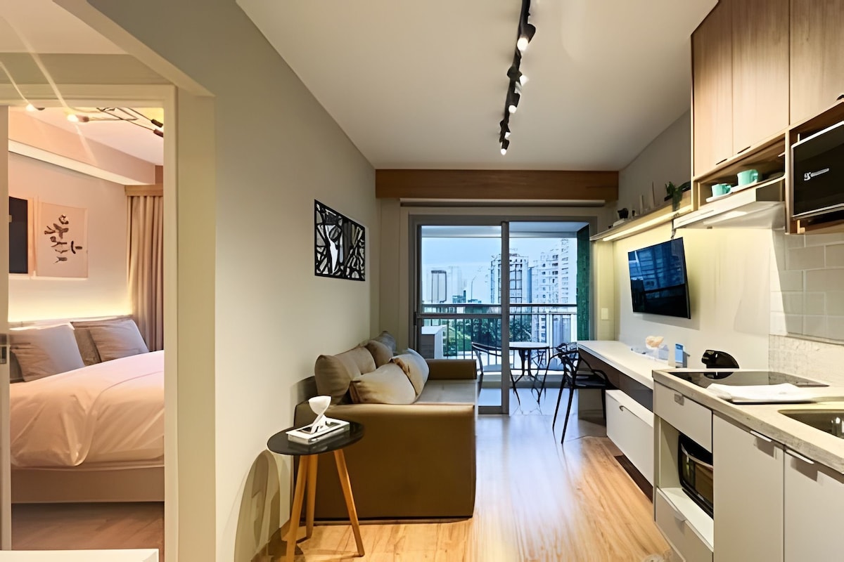 Sodobno in popolno garsonjero v Moemi, eni najbolj očarljivih in dobro lociranih sosesk v São Paulu. Nahajate se le nekaj minut od podzemne železnice, letališča Congonhas, trgovin in parka Ibirapuera, zato boste blizu vsega, kar potrebujete, ne glede na to, ali gre za prosti čas, delo ali zdravstveno oskrbo. Prostor ima hiter Wi-Fi, klimatsko napravo, popolnoma opremljeno kuhinjo, posteljnino in brisače. Stavba ima ogrevan bazen, masažno kad, telovadnico, pralnico in mini trgovino. Opomba: na območju je do določene ure hrup letal