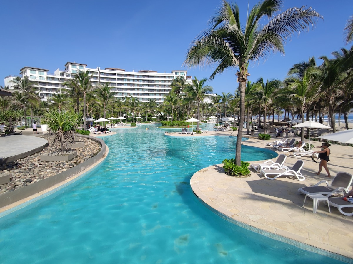 2 recámaras 2 baños, Max 6 personas,cocina, comedor, pantalla en la sala y recámara principal con sky , limpieza diaria incluida servicio de bar y snacks en todas las albercas y en la playa, restaurante, carril de nado, canchas de tenis y paddle, spa, gym,ludoteca,mesas de billar, Toboganes, 2 aqua park, transporte a playa, Se deja un deposito de 5 mil en efectivo en casa club que te devuelven a tu salida. Todo habilitado 100%