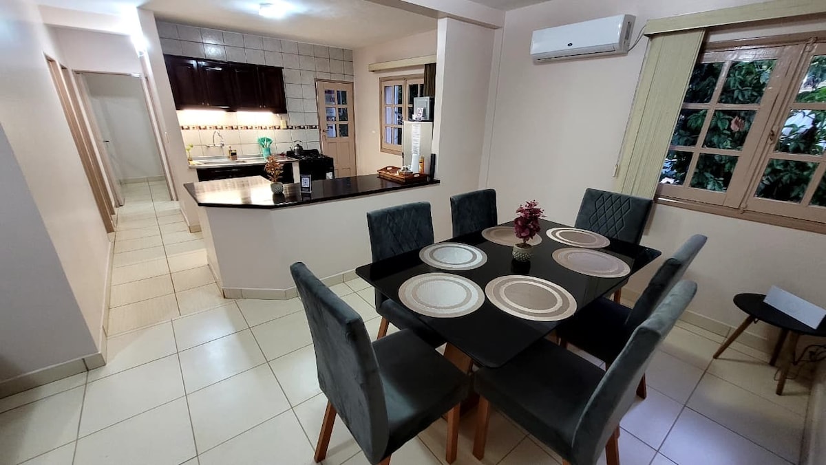 Uživajte v tem prostornem in svetlem stanovanju v osrčju Iguazúja. Ima 2 spalnici, 2 kopalnici, balkone in žar, kar je idealno za sprostitev po celodnevnem sprehodu. Kuhinja je popolnoma opremljena, tako da lahko kuhate v udobju, z balkonov pa lahko uživate v zelenem razgledu, ki vas vabi k počitku. Njegova lokacija je neverjetna: blizu vsega ste, z mirom, kjer lahko uživate doma. Poleg masažne kadi, hitrega omrežja Wi-Fi in delovnega prostora.