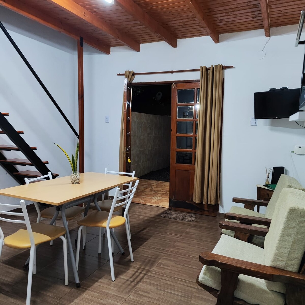Casa de 2 plantas muy agradable y cómoda. Tiene: patio con parrilla, lavadero con tender para el aseo de la ropa, antebaño, baño, cocina comedor, un amplio dormitorio. Ubicada en un barrio residencial tranquilo, a 1 km del casco céntrico . En la sección de fotos hay un mapa para apreciar mejor la zona. Excelente atención de sus anfitriones quienes estaremos a su disposición.
