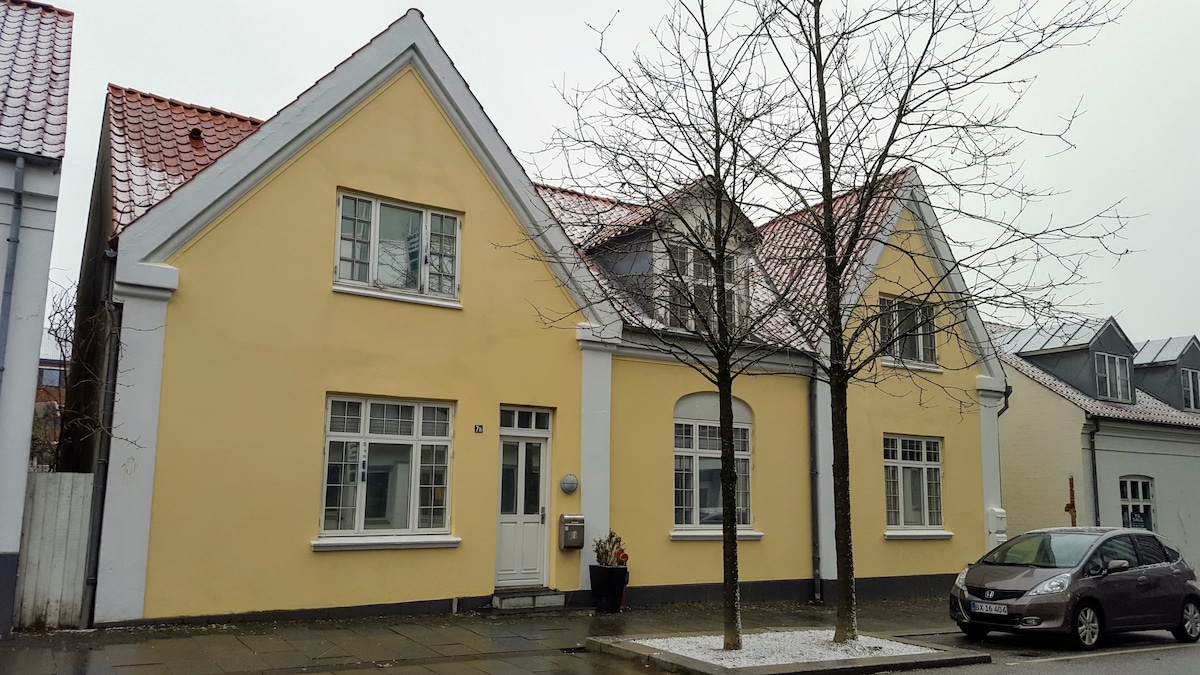 Majhna rumena prizidka se nahaja sredi čudovite narave hriba. Tiho je in jeleni se srečno pasejo na vrtu, ko se dan zbudi. Štedilnik na drva je dober v stari hiši, iz predelanega stanovanja pa je pogled na travnik in polja. V glavni hiši živijo Filip, Helene, Asger (4) in Axel (2) skupaj z najinima srečnima psoma (ritmi). Do Bryrupa je 2 km, kjer se lahko zabavajo kopališče ob jezeru, teniška igrišča ali staro veteransko igrišče. Zgoraj je zakonska postelja, spodaj pa raztegljiv kavč. 1 velika soba.