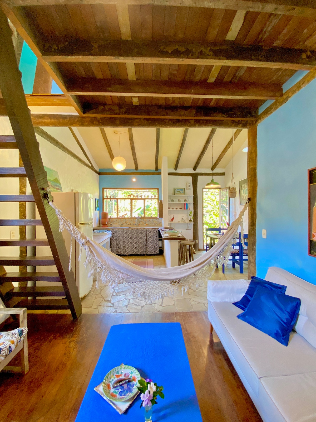 Začarana in trajnostna hiša na rajski plaži Bonete, izolirani ribiški vasici na jugu Ilhabele, kjer ni avtomobila, dostop pa je mogoč samo z ladjo ali potjo. V osrčju atlantskega gozda je hiša posledica sanj, ki so jih v zadnjih letih zgradile naše roke z recikliranimi materiali, rudnimi predmeti, ki si vedno prizadevajo čim manj vplivati na okolje. POMEMBNO:( Hiša je predelano stanovanje brez sten v sobah)