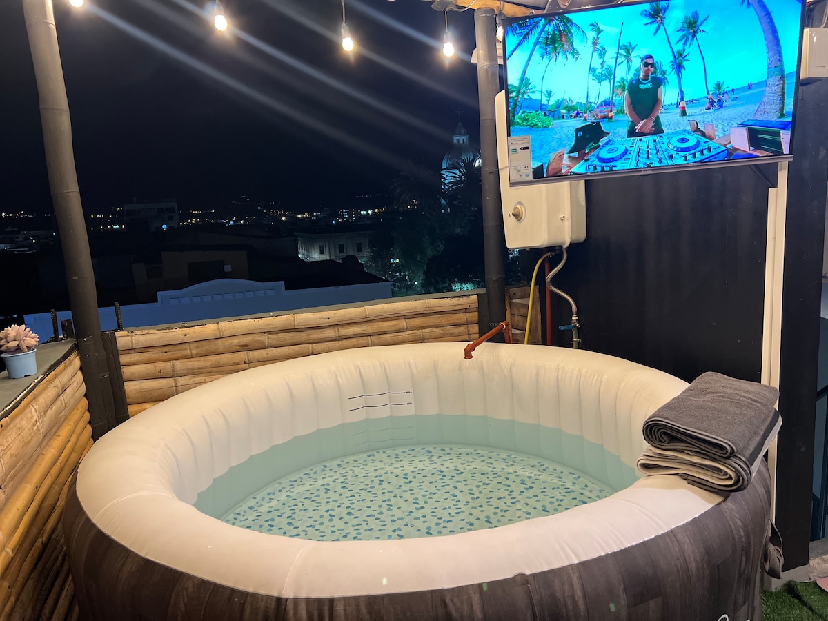 Dobrodošli v ekskluzivnem prenočišču! Nahajamo se pred zelenimi pljuči mesta, nekaj metrov od reke Tahuando in 15 minut od središča mesta Ibarra. V njej lahko biva do 8 oseb, ki lahko uživajo v čudovitih vrtovih, svežem zraku in privilegiranih razgledih ter ogrevanem bazenu s sončnimi kolektorji, turški kopeli, masažni kadi, prostoru za žar, kuhinji, dveh jedilnicah, prostoru za ples, ognjišču, garderobah, prhah, kopalnicah in telovadnici. To je bivališče, ki si ga zaslužite.